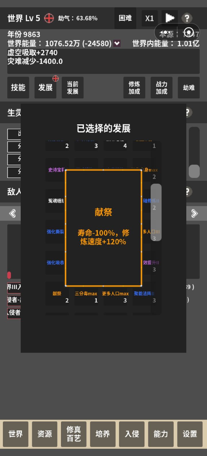 进入游戏后,看完新手引导,了解一下功能属性首先这个游戏世界能量清零游戏就会结束,所以一直保持世界能量增加不要变成负数1️⃣技能优先点满虚空吸取,其他先不用管(提升世界等级,增加技能上限)2️⃣发展如图刚开始出现蓝色技能点的可以点,去技能那里给虚空吸取,偶尔点一些灵石矿把修真百艺点开,全部一键确定后就不用管了,后面出现向淬毒,三分毒,尸爆,毒圈之类的毒词条都可以点,有虚空基数优先点,保持