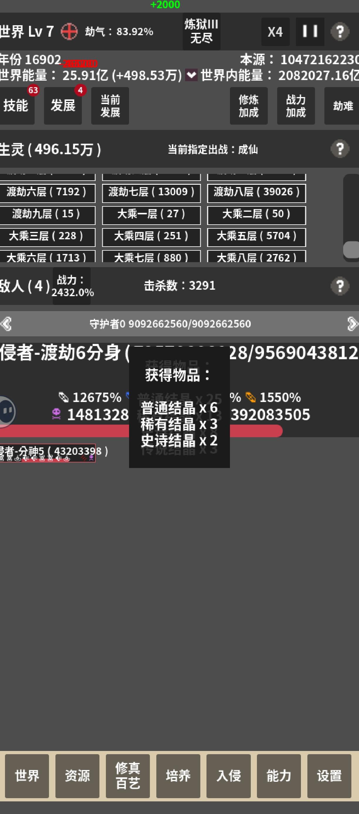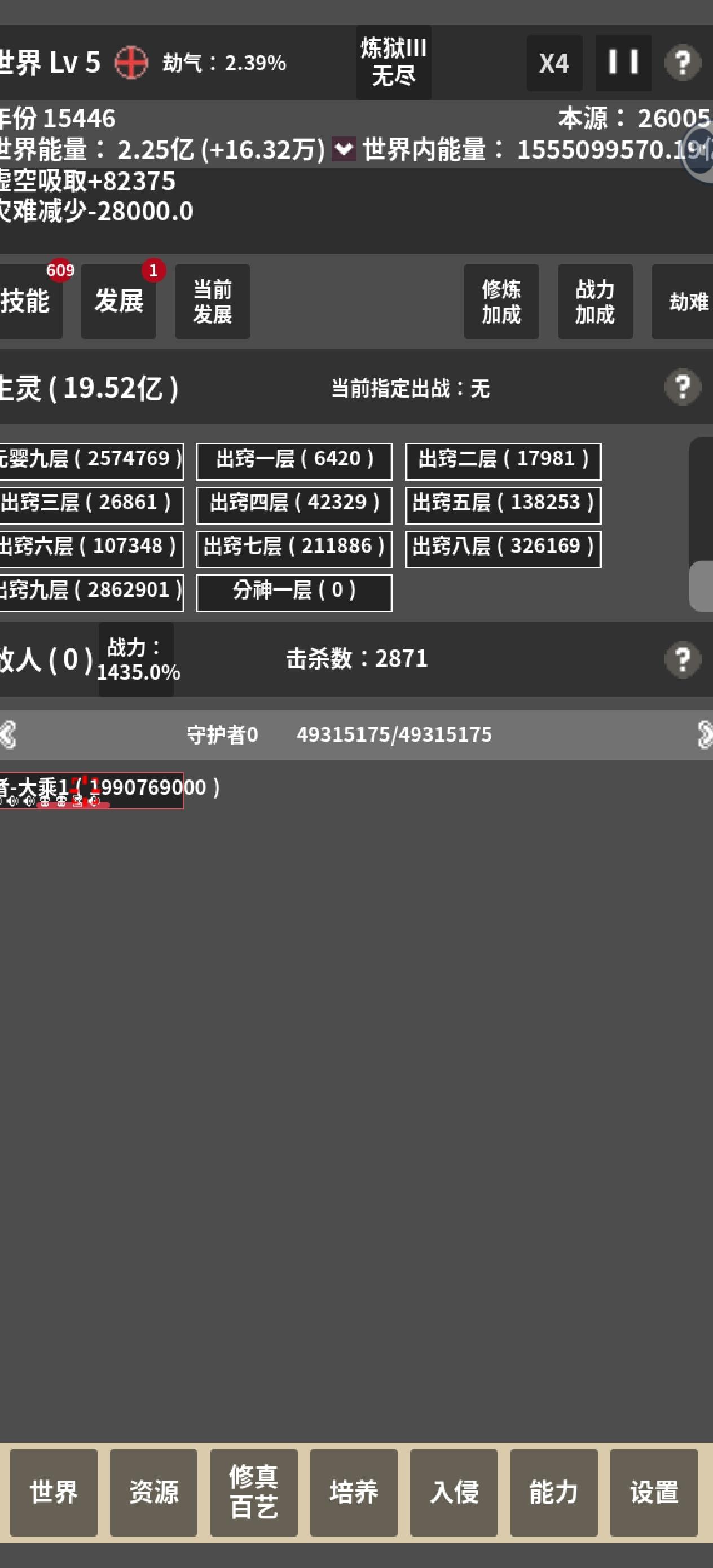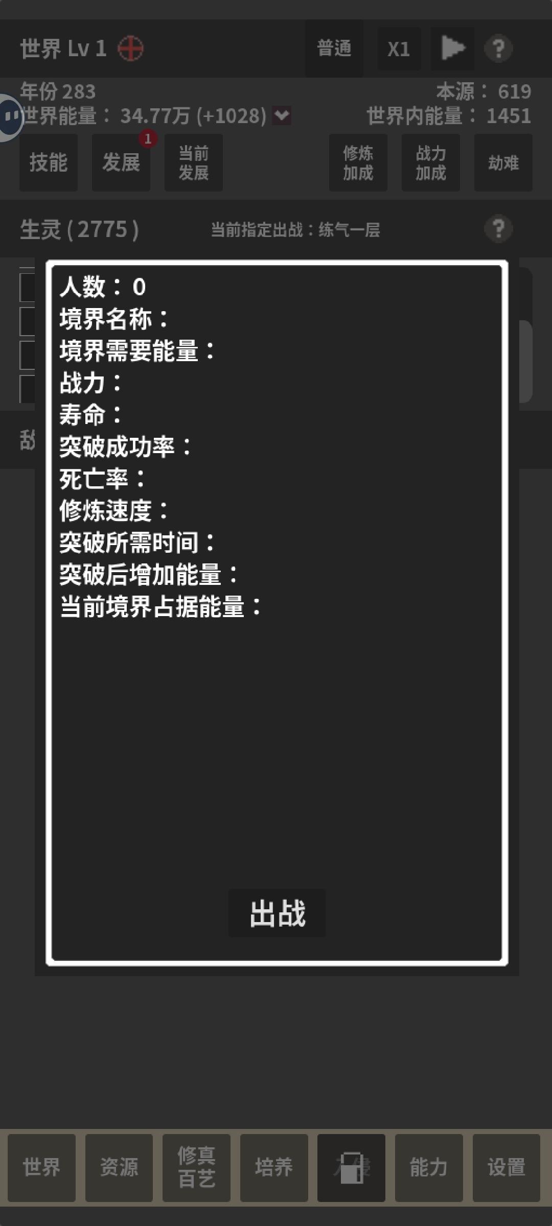 我敢打赌绝对没有比这更优的战略了 1.首先你开局必须有>300+100*n个发展点数(n=开局出生人口/6000) 2.进游戏把发展倍率调到百倍,暂停游戏(一定要在人口只有100的时候就点击暂停)然后点击发展,如果刷到“世界屏障改Ⅱ”就点击,否则就退出游戏重新进入存档,再次点击发展,一直重复3次 (注:点击发展之前一定要暂停,要不然之前的发展无法保留,重新进入存档后,需要在时间流逝前就点击暂