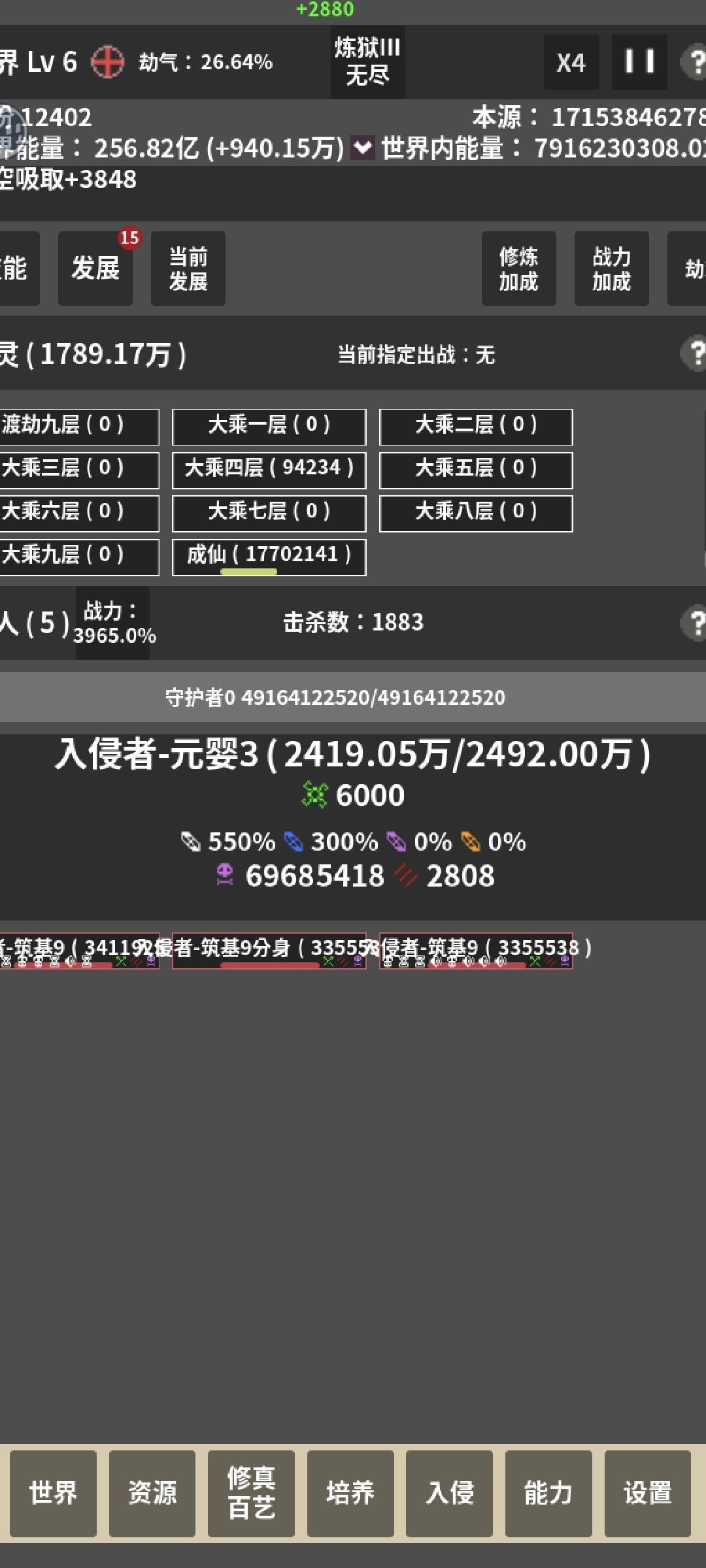 我敢打赌绝对没有比这更优的战略了 1.首先你开局必须有>300+100*n个发展点数(n=开局出生人口/6000) 2.进游戏把发展倍率调到百倍,暂停游戏(一定要在人口只有100的时候就点击暂停)然后点击发展,如果刷到“世界屏障改Ⅱ”就点击,否则就退出游戏重新进入存档,再次点击发展,一直重复3次 (注:点击发展之前一定要暂停,要不然之前的发展无法保留,重新进入存档后,需要在时间流逝前就点击暂