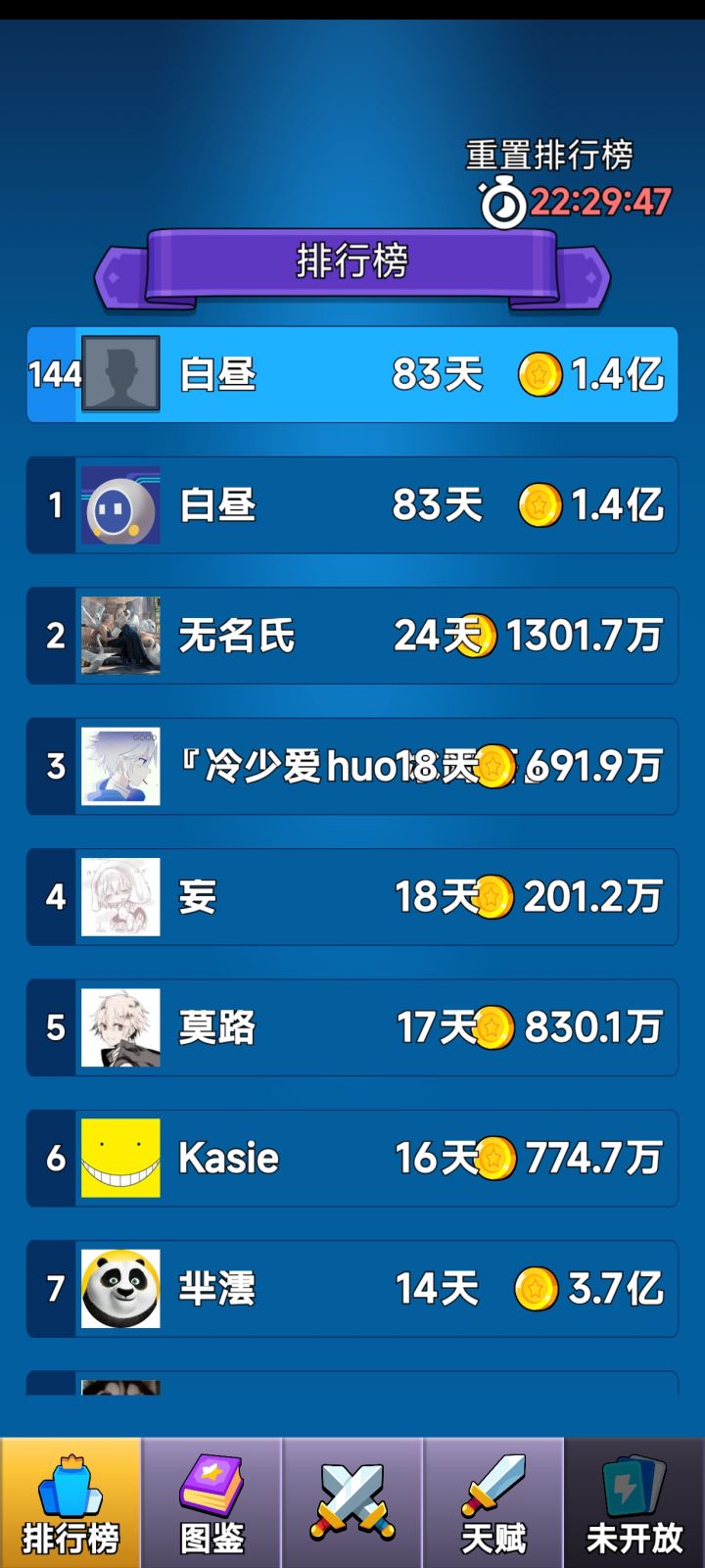 耐玩性不高,有点太简单了。(有攻略,介意的人勿进)前期还挺紧张刺激的 ,但到了后期就索然无味 ,排行榜单纯就比的谁有耐心,只要不作死血,基本没有出局的可能 。。。至少,100天以内是完全没问题的 。