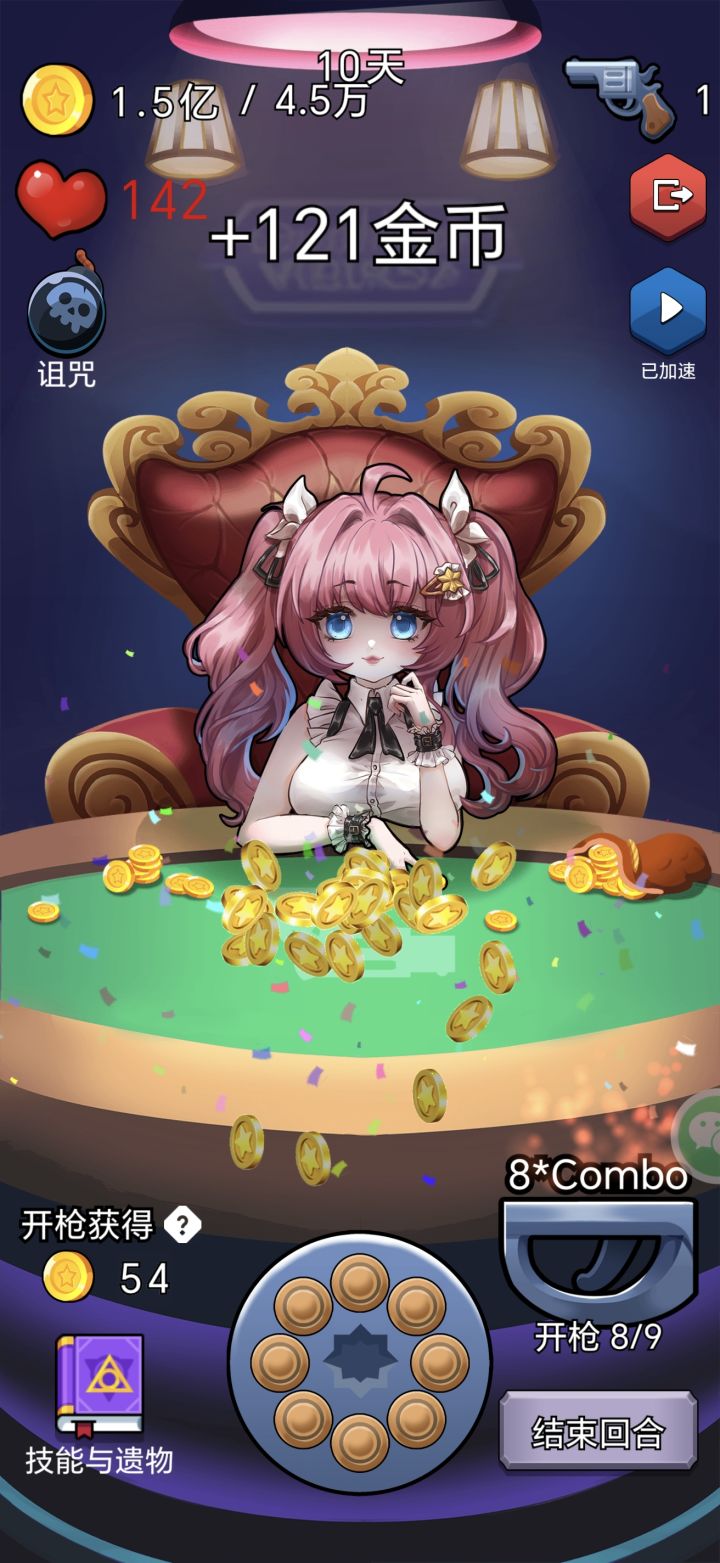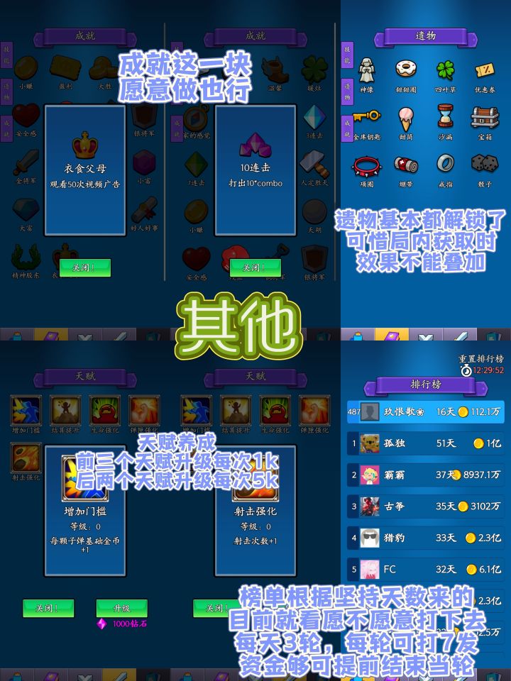 幸运草和叉子,如果有,一定要选 ,这会保证你:第一枪和最后一枪无法受到伤害 。一开局金币的要求很少,可以先提升血量,其次,在增加金币效益。不然,很难保证你能活下去 。选择技能一定要利益最大化 ,三个技能 ,如果没有血量就优先选回血量最多的 。或者说,可以保证游戏继续下去 ,就选目前对自己最有利的技能 :比如,有幸运草,首选技能就是精准预测。后期子弹越放越多就是,子弹风暴和熵增弹仓。诅咒一定不能选:减少开枪次数和上弹次数,这到后期可能会是致命的最大因素 。