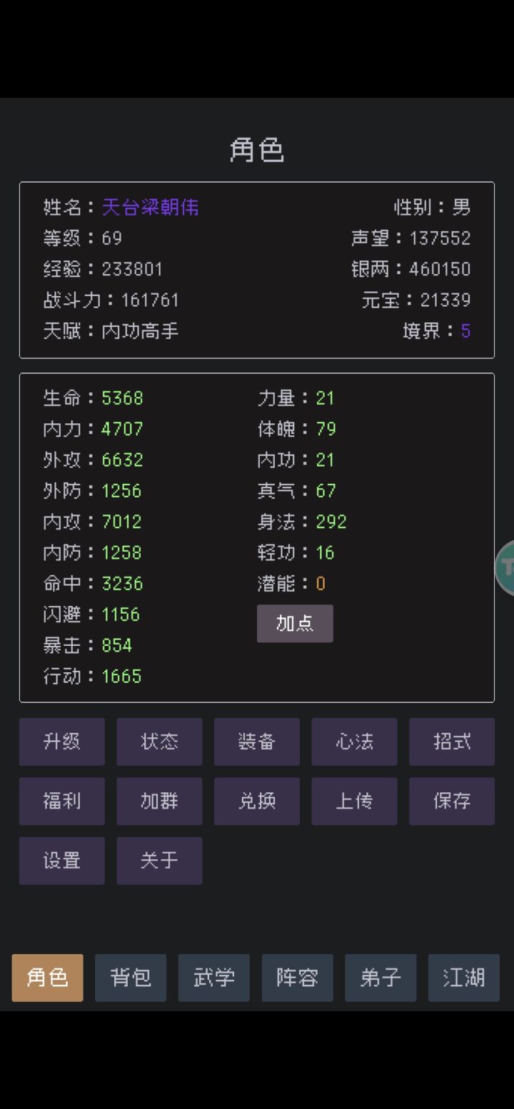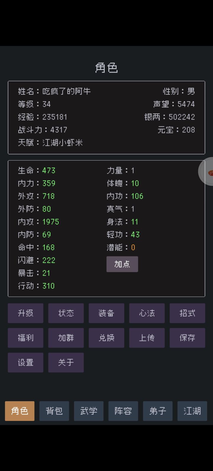 很不错的小游戏,主要是武学和武器属性搭配。还有天 赋开始我没选,再换就得创立门派之后才可以了,我用 的初始小虾米那个,没有群里的大佬刷的好,但是也够 用,反正后面都能换。 还有就是创立门派后可以自创武学,还不知道怎么样, 没玩到哪。 整体来说是一个可以消遣时间的小游戏,也玩过作者之 前的游戏,支持一下,作者大大加油