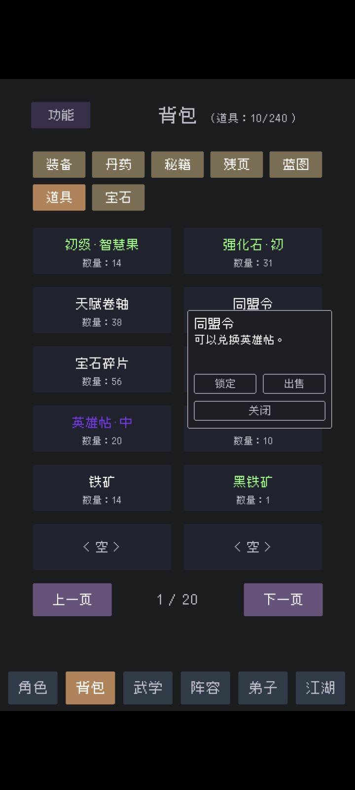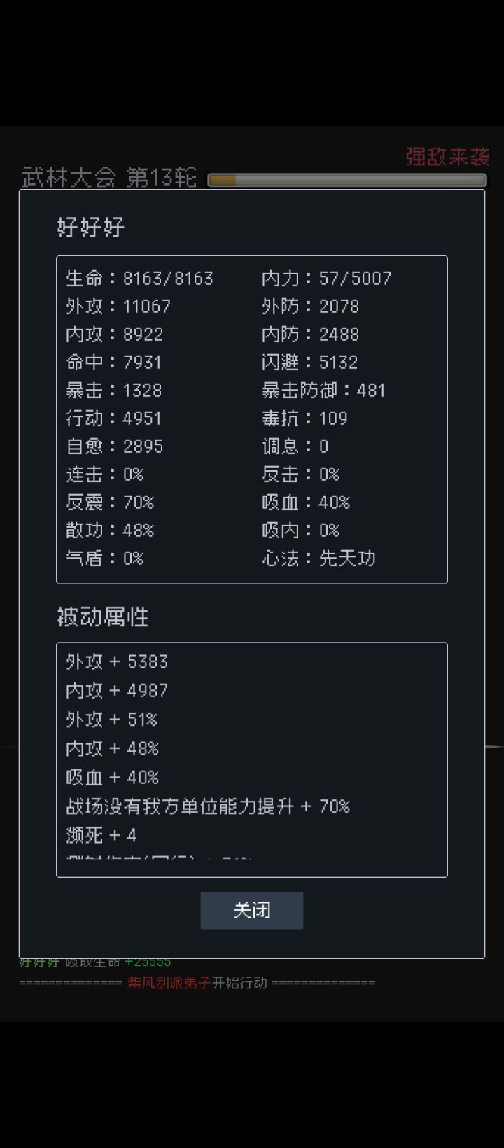 发现一直没人写攻略,我给新玩家重新写一下吧。写的凑合请给个赞,谢谢啦!贴下属性面板,看游戏群里群主暂时没空更新游戏,版本更新无具体日期。武林大会没有尽头,游戏通关少林后一直在这挑战极限。先说玩法,行动条回合制挂机,新手村郊外刷下等级,有点能力了就往高级点的地图跑,带小恶魔的就是BOSS,比如恶霸宅邸,属性点可以10元宝洗练,开始可以加点力量方便刷图,打的过恶霸时就能获得元宝了。英雄帖就是用来挑