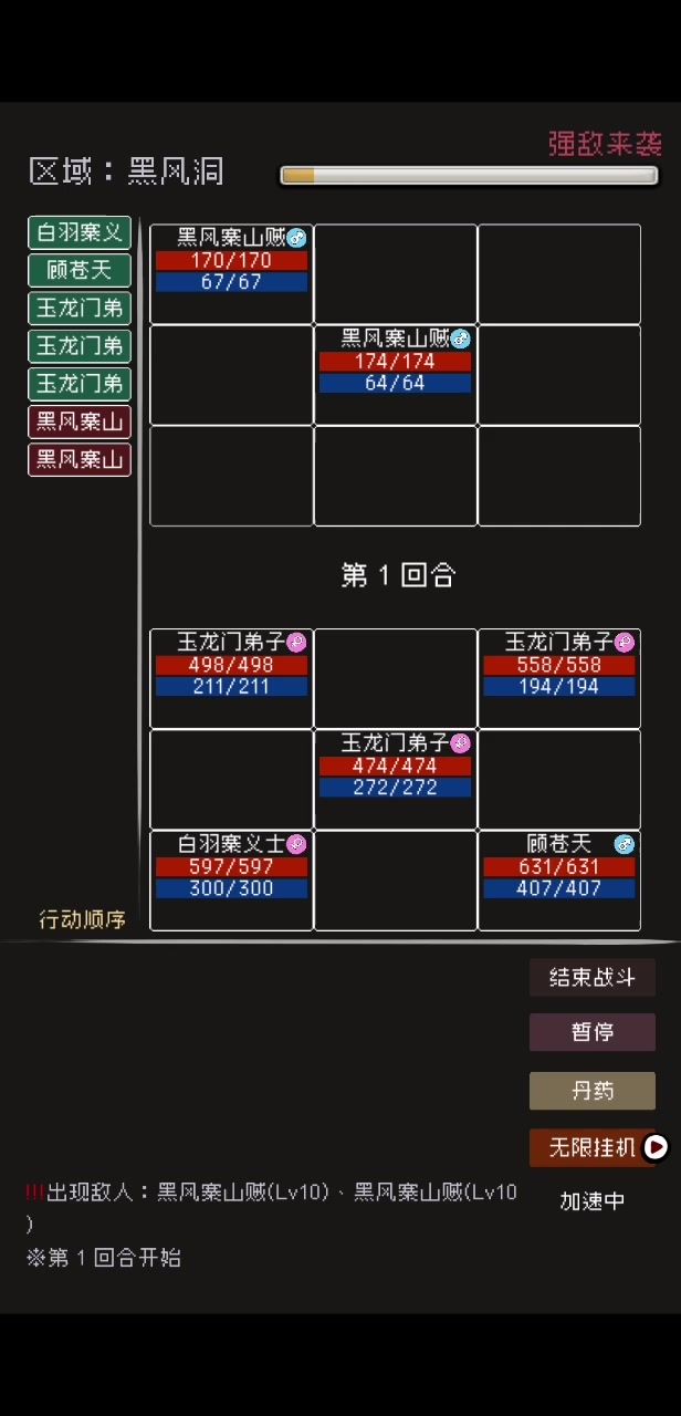发现一直没人写攻略,我给新玩家重新写一下吧。写的凑合请给个赞,谢谢啦!贴下属性面板,看游戏群里群主暂时没空更新游戏,版本更新无具体日期。武林大会没有尽头,游戏通关少林后一直在这挑战极限。先说玩法,行动条回合制挂机,新手村郊外刷下等级,有点能力了就往高级点的地图跑,带小恶魔的就是BOSS,比如恶霸宅邸,属性点可以10元宝洗练,开始可以加点力量方便刷图,打的过恶霸时就能获得元宝了。英雄帖就是用来挑