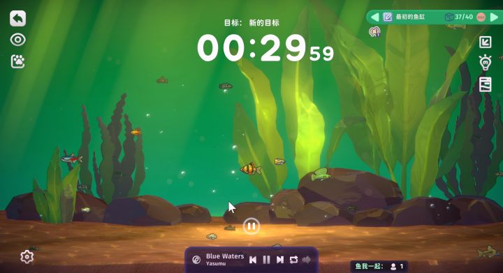 游戏一开始,就介绍本作最重要的一个系统:专注模式,在这个模式中可以先选择好想要听的音乐,可以用游戏自带的,也可以播放自己的音乐,或者是使用白噪音,这个挂机的时间也时由自己设定的,把时间和喜欢的音乐都配置好后,就可以以最纯粹的方式进行挂机和观赏鱼的经历。