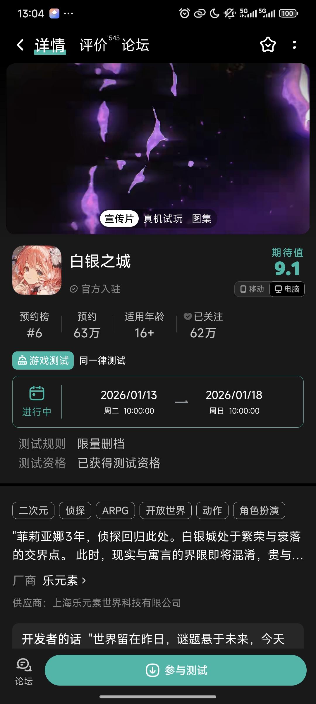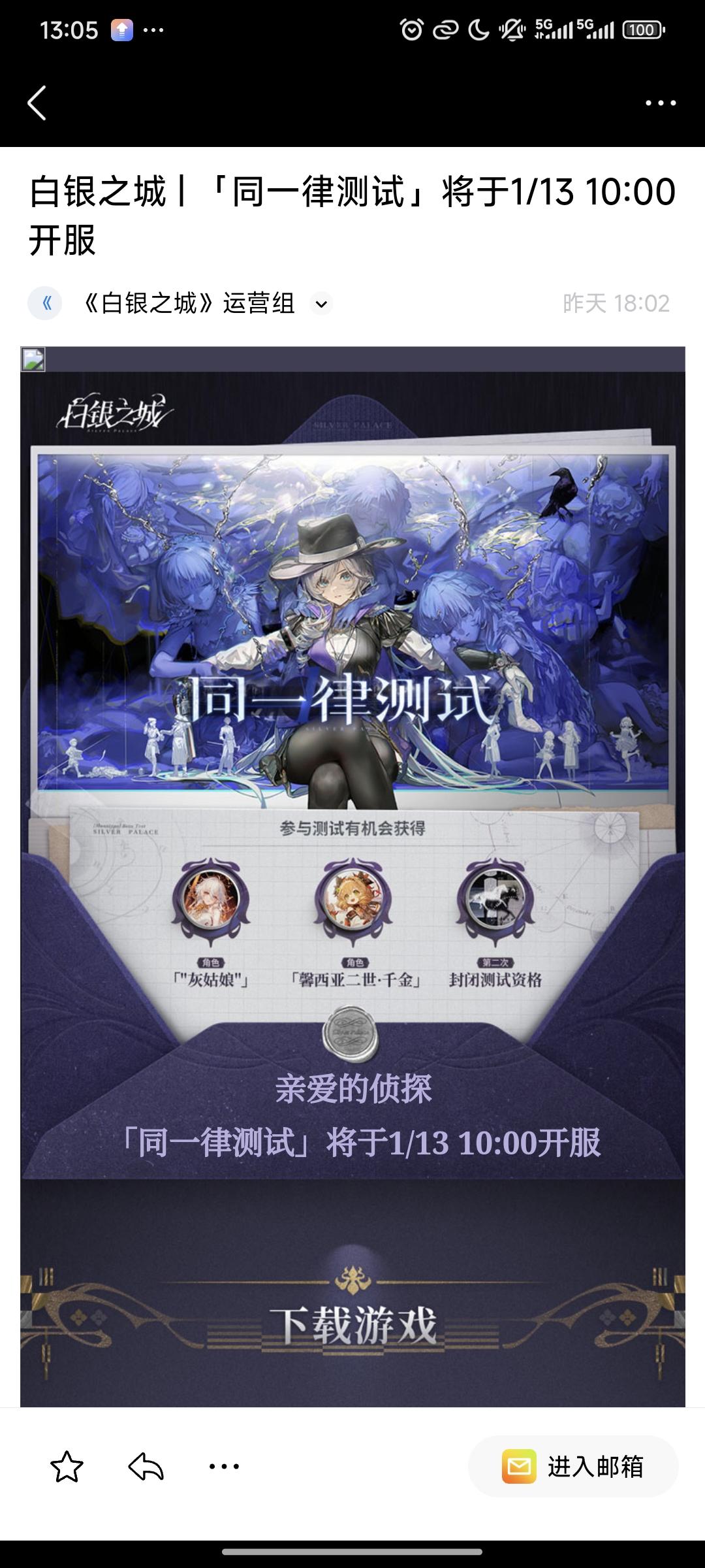 「同一律测试」定档,资格已在陆续发放中▍「同一律测试」时间:1月13日 10:00 ~1月18日 10:00▍侦探可通过以下链接查询资格获取情况https://heurl.cn/webspcn获得资格的侦探可根据指引进行测试包体预下载。详情请参考长图。#白银之城 #同一律测试