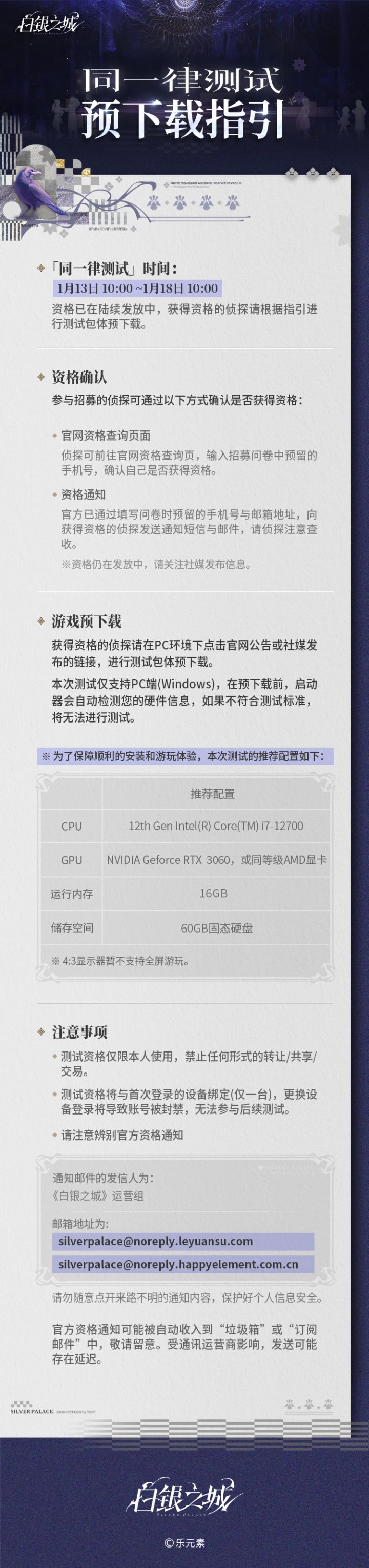 「同一律测试」定档,资格已在陆续发放中▍「同一律测试」时间:1月13日 10:00 ~1月18日 10:00▍侦探可通过以下链接查询资格获取情况https://heurl.cn/webspcn获得资格的侦探可根据指引进行测试包体预下载。详情请参考长图。#白银之城 #同一律测试