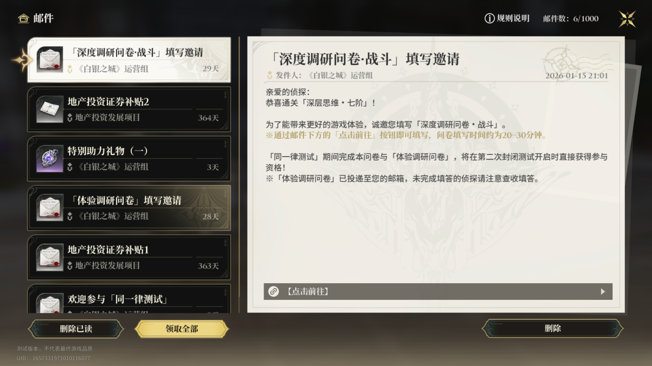 「同一律测试」定档,资格已在陆续发放中▍「同一律测试」时间:1月13日 10:00 ~1月18日 10:00▍侦探可通过以下链接查询资格获取情况https://heurl.cn/webspcn获得资格的侦探可根据指引进行测试包体预下载。详情请参考长图。#白银之城 #同一律测试