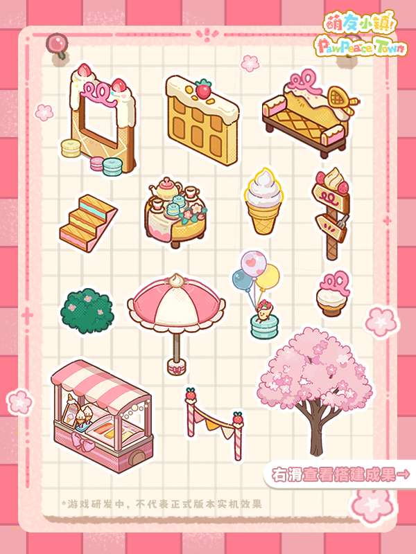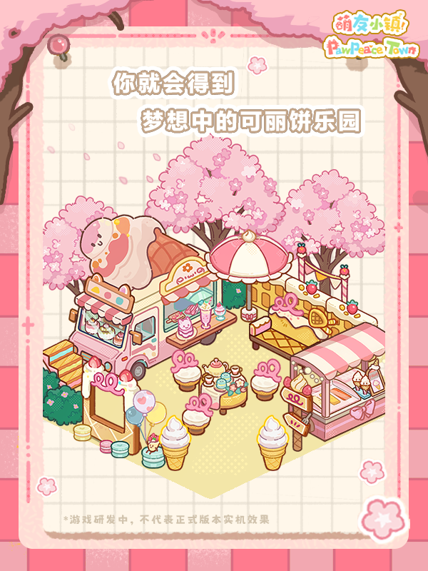 ✨萌友们集合!把甜品车+甜系装饰搭一搭,就能get梦想里的「可丽饼乐园」!!乐园里藏了超多甜细节:连樱花树都是粉嫩嫩的!花瓣飘下来都带着奶油香的既视感🍪设施全是甜品同款!沙发是华夫饼纹路的、桌椅裹着奶油色装饰,坐上去像陷进了刚做好的甜筒里🍦随处都是 “甜摆件”:马卡龙小凳子、冰淇淋灯、连指示牌都挂着草莓装饰🍰摊位窗口直接摆满了可丽饼 + 奶昔,连遮阳伞都是粉白甜系配色,感觉下一秒就能端到