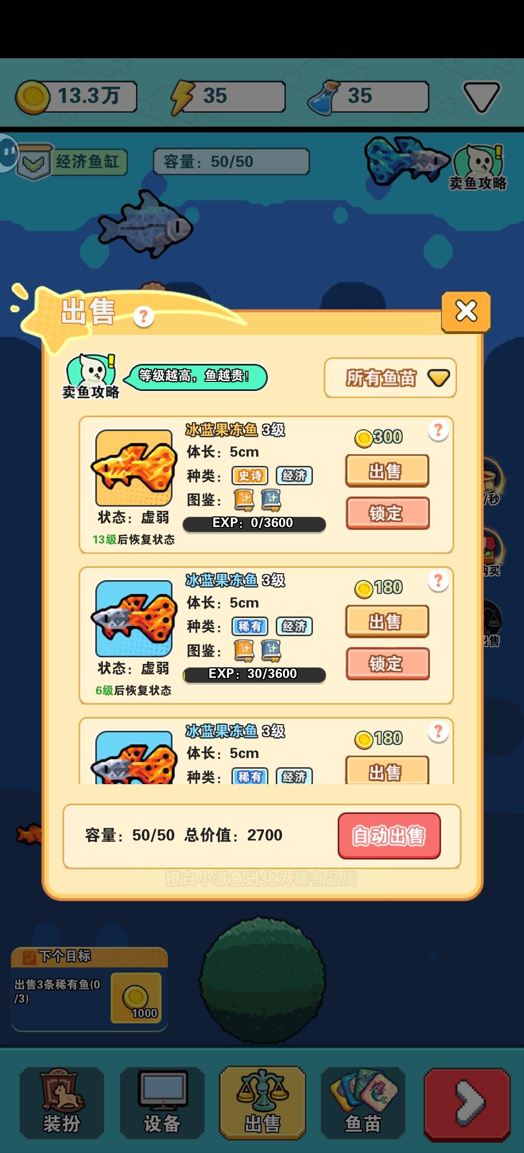 连刷第一个鱼缸,卖几个小时够300万,最后一个缸开了,就直接买300的(适当升几次普通成长,售价,饲料经验,效率高的话留下变异史诗和史诗以上的一直喂),300的直接卖,几次就够900的。多买卖几次就不缺金币了,适当升几次史诗售价提升,提高刷钱速度。