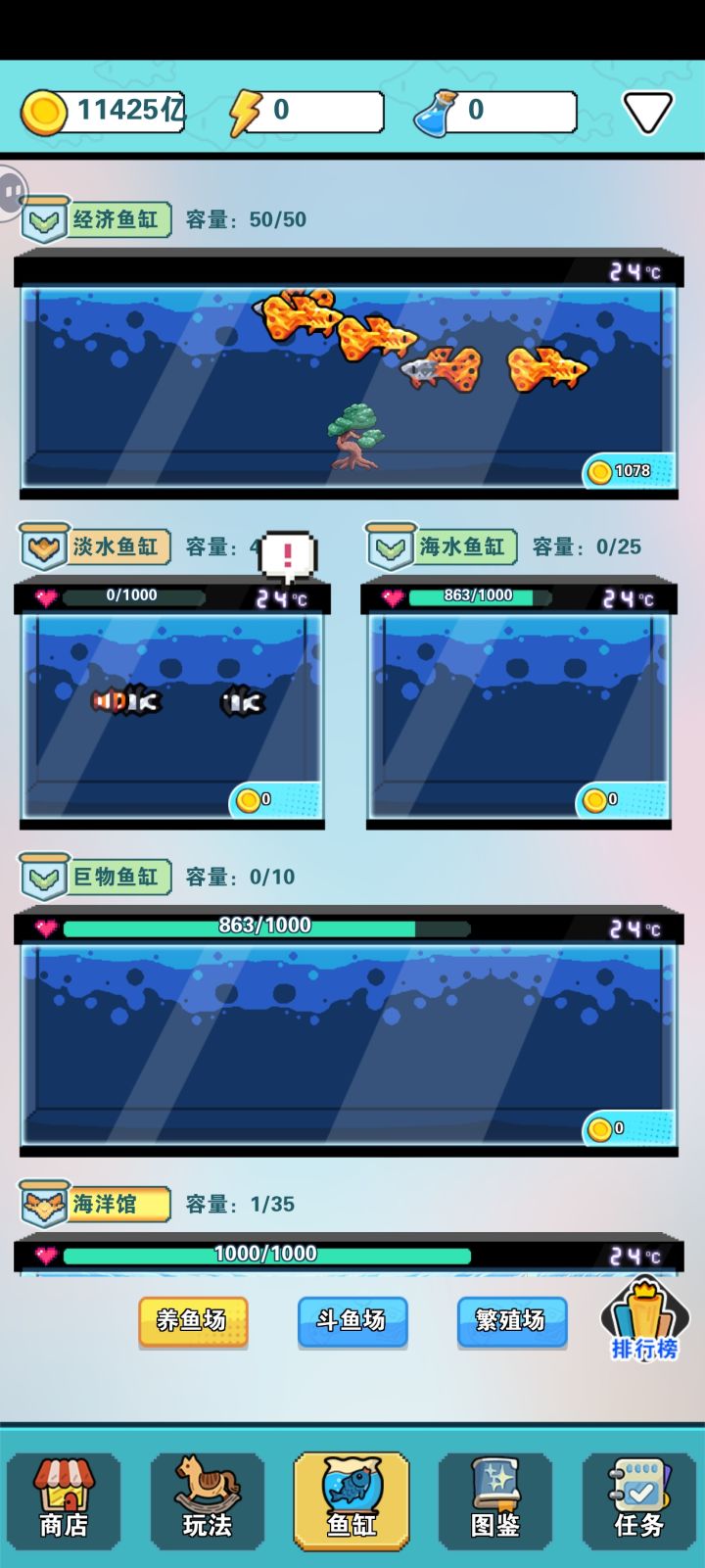 连刷第一个鱼缸,卖几个小时够300万,最后一个缸开了,就直接买300的(适当升几次普通成长,售价,饲料经验,效率高的话留下变异史诗和史诗以上的一直喂),300的直接卖,几次就够900的。多买卖几次就不缺金币了,适当升几次史诗售价提升,提高刷钱速度。