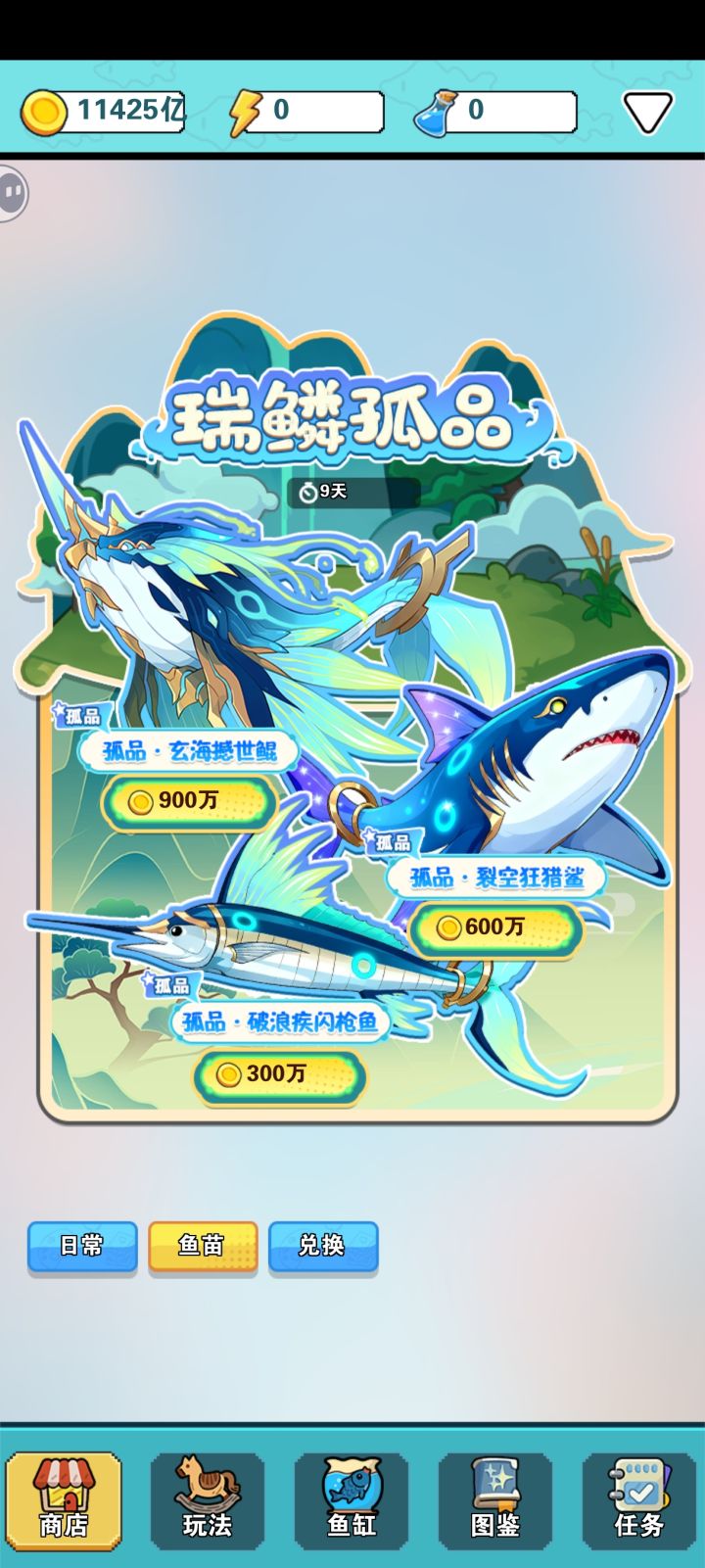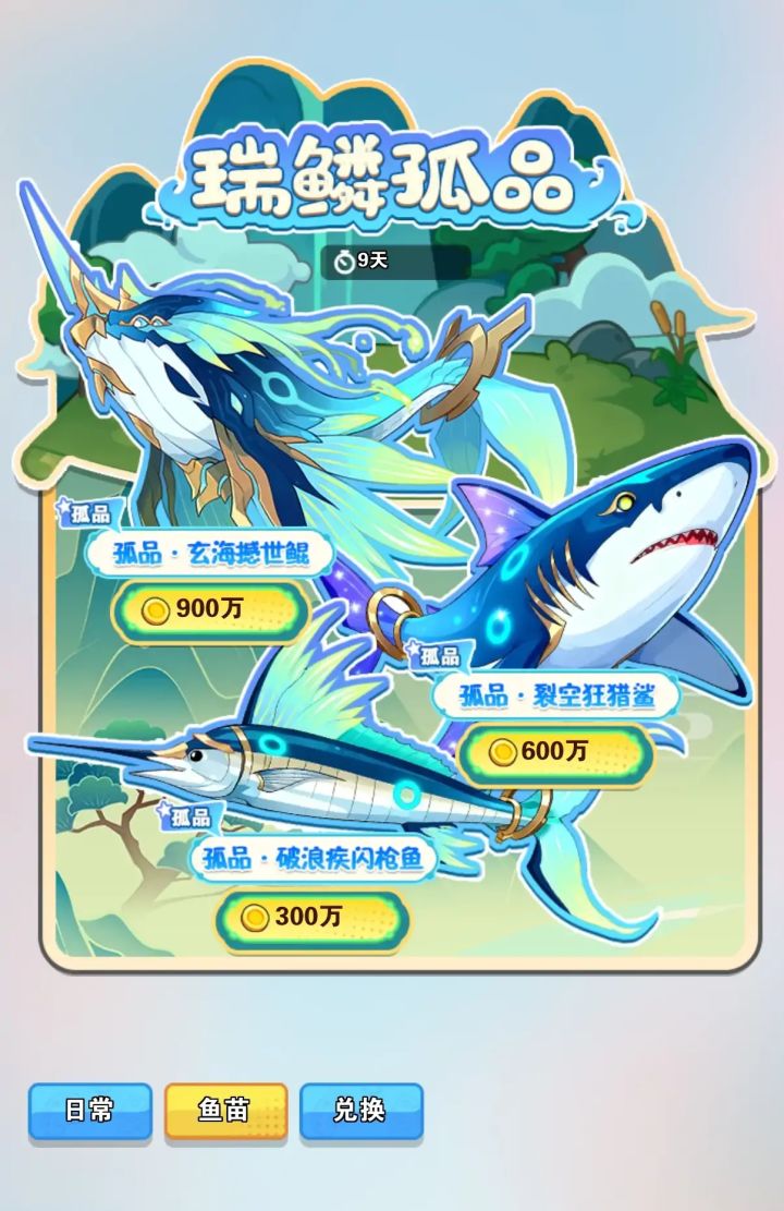 ←玄海撼世鲲“九天孤品·玄海撼世鲲——深海至尊,撼动四海,九百万价值等你征服!”←裂空狂猎鲨“裂空狂猎鲨——疾速如风,猎杀全场,六百万战力不容小觑!”←破浪疾闪枪鱼“破浪而出,疾如闪电!三百万珍稀枪鱼,穿梭海浪如闪电,带你领略极速海洋!”“九天倒计时,孤品不等人!速来瑞鳞孤品,带走属于你的海洋神话!”#福利活动 #单机游戏 #休闲游戏
