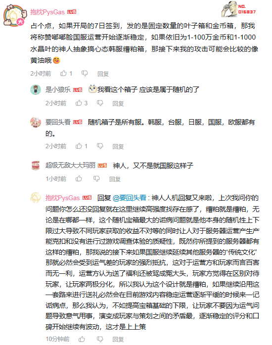 在逐渐稳定运营的情况下会极有可能因为疏忽而二次犯其他服同样让人持续诟病的问题,随机宝箱最大的诟病问题就是,随机性上下限过大导致不同玩家获取的收益不对等,间接导致玩家对于服务器运营产生产能,也会扩大玩家对于运营方是否有参考玩家建议的质疑性,既然你所提到的服务器都有这样的糟粕,那我说的接下来如果国服继续延续其他服务器的“传统文化”那就必然会受到运气差的玩家的强烈抵抗,这对于运营方和玩家而言百害而无一利