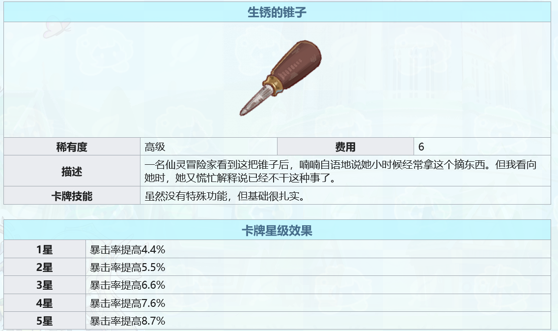 鉴于某人说不过就开始删评论的小巧思,我还说单独开一贴。我个人结论是:匕首优于锥子。锥子:暴击和低费。匕首:爆伤和恢复sp。1、由于国服是爆伤从400%砍到了250%,导致暴击爆伤直接沦为难兄难弟,收益两者拉不开差距,2、锥子低费过牌最大问题是实际没有刚需场景,由于符文有4费符文5费符文各1张,随机硬币1张,加上每回合4费过牌1次,就是常规已经有4张过牌,导致锥子过牌作用削弱,并不具备独特