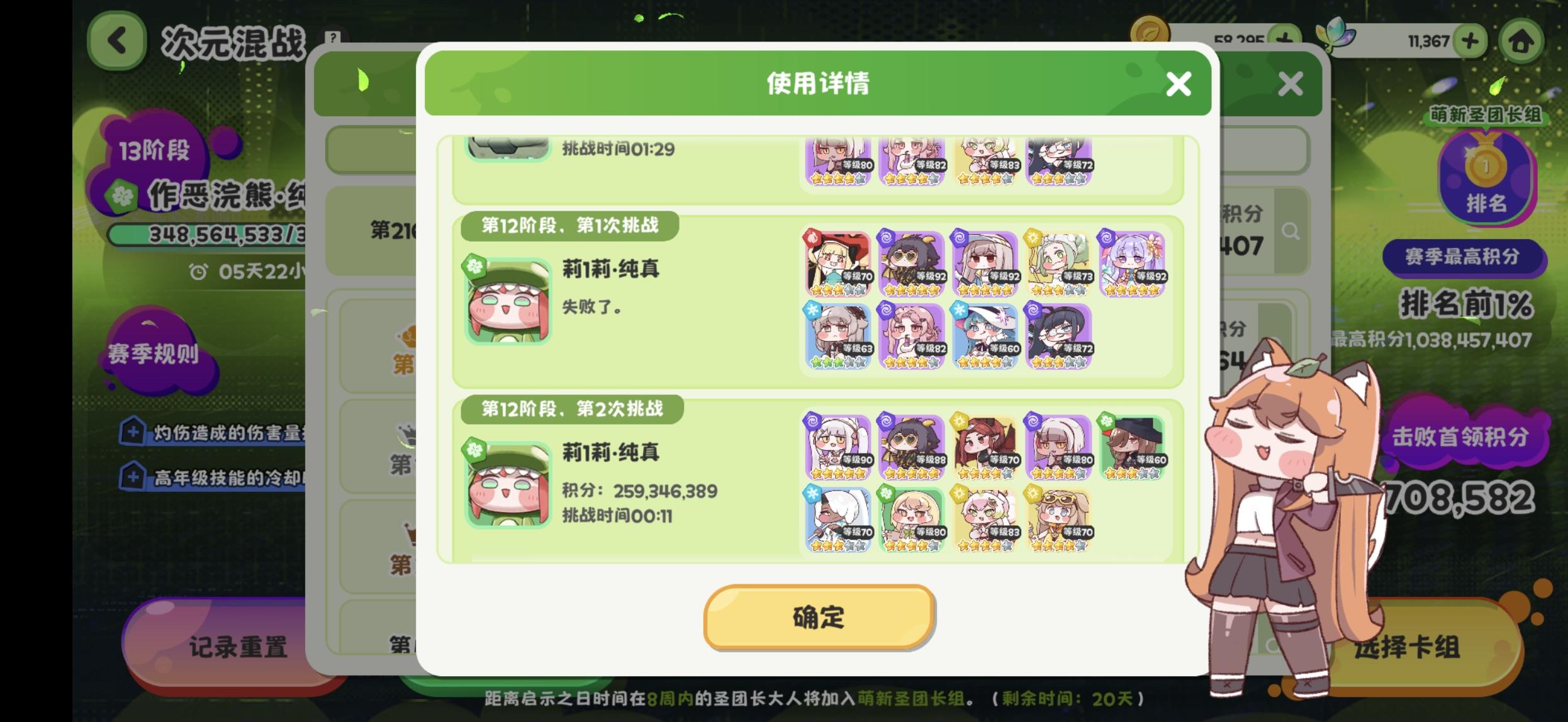零氪也是玩了24天了,进度小结,目前中辣也打到了21章,次元还是老样子,先打到不好打的地方,然后提练度,最后一天打一刀,这次一档应该也是稳了。相比上次的唯一区别是,这次把11打过了,可能是黑龙练度高了一点,然后雨伊全程刷小技能,才勉强过吧。过12的话估计得用黑龙转向技巧才有可能一刀过,不过我这练度应该不可能,也没多余资源凑二队,还是再摸摸鱼,下次次元应该有机会。如果接下来一周,不像上周一样四天出一