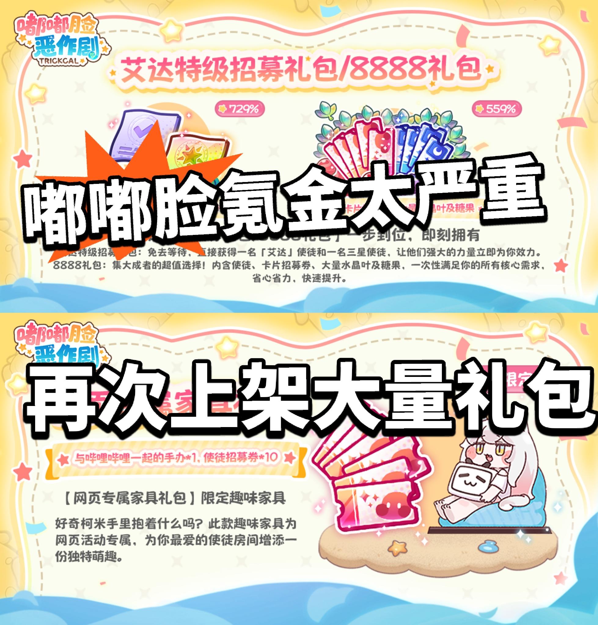 近日 嘟嘟脸恶作剧官方刚公布上架一大波礼包,就被玩家疯狂吐槽,评论区全是不满的声音!大家吐槽的原因主要有3点。礼包价格太贵,半点儿白嫖奖励都没有,游戏里能获取的资源还少得可怜。 这次上新的礼包种类特别多,有带B站手办和招募券的网页专属家具礼包,还有分防御、输出、辅助的指定职业使徒礼包。还有8888特级招募礼包,以及300、1500、3400档位的水晶叶礼包。一开始玩游戏时候,本来以为商城