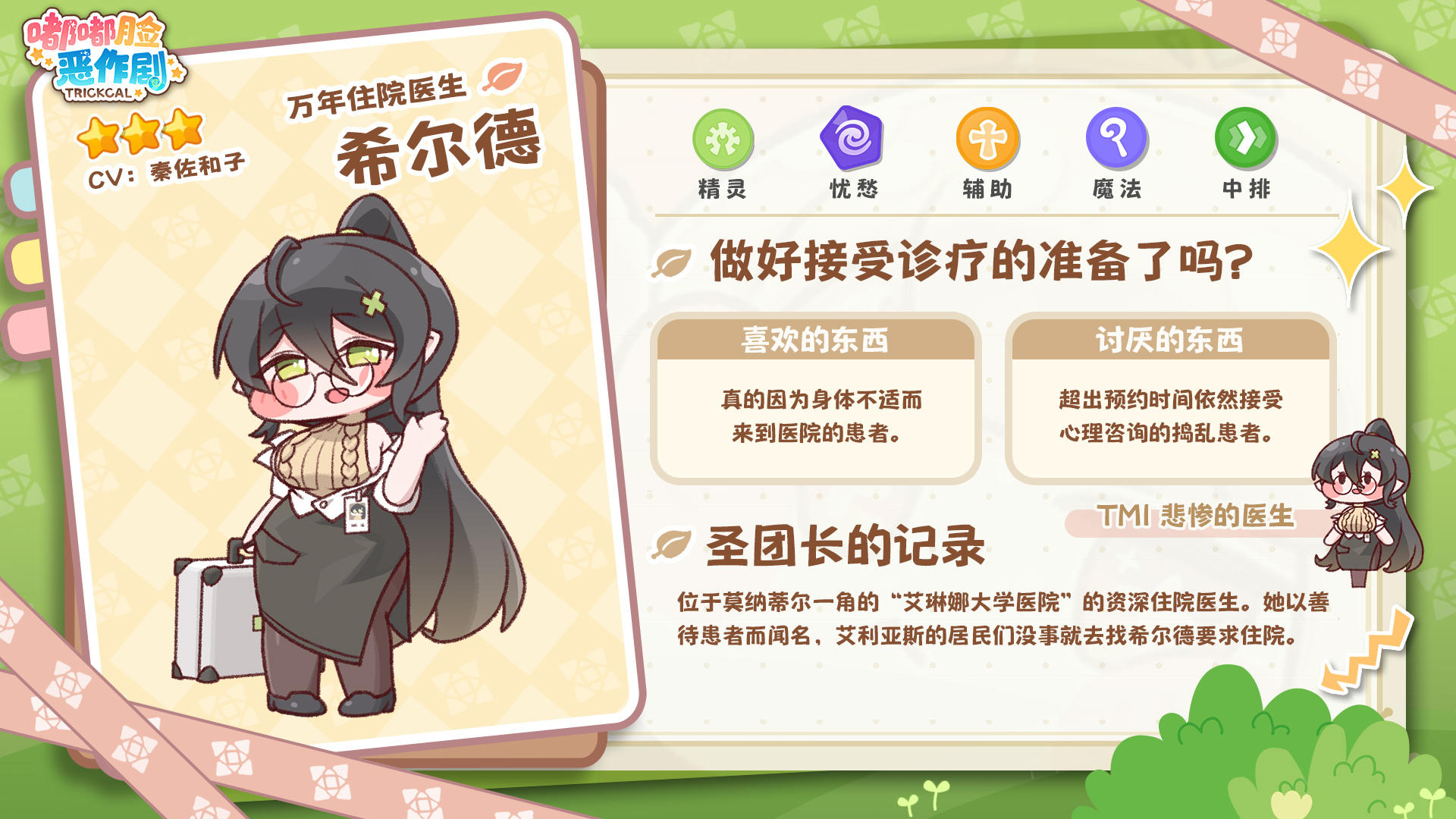 使徒档案「万年住院医生」 -希尔德位于莫纳蒂尔一角的艾琳娜大学医院的资深住院医生希尔德对于明显装病的患者,不做任何检查也直接收治原本以为她是为了赚钱的庸医,但据说她并不向病人收取任何费用>>>喜欢的东西真的因为身体不适而来到医院的患者>>> 讨厌的东西超出预约时间依然接受心理咨询的捣乱患者>>> 圣团长的记录她以善待患者而闻名,艾利亚斯的居民们没事就去找希尔德要求住院▌留言抽