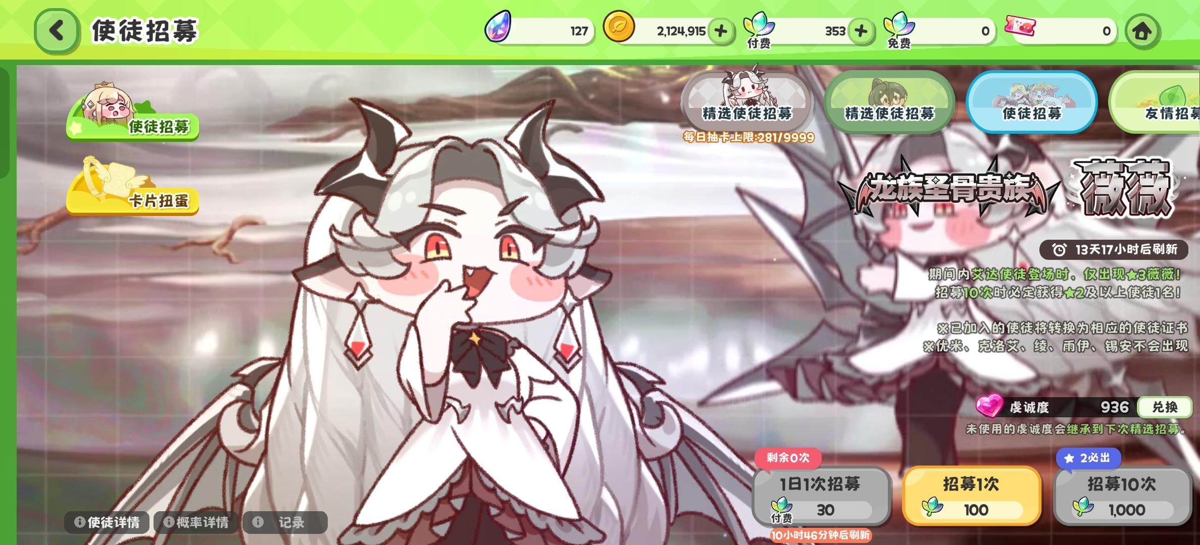 后一张图是几天前的叶子,今天更新完领完邮件我记得是4w1k多叶子加上20几张券,抽了大概50抽武器?武器也有十几张券,剩下都投角色池了,3%的概率你就给我出了大概6个还是7个三星,里面三个new,VV影子都没见到,一个暗奶,一个皮克拉一个绿色的谁,剩下还能给我两个莱威,真是恶心坏了,一下就不想玩了,我看看缓缓能不能缓过来。#嘟嘟脸恶作剧 #嘟嘟脸恶作剧下架民间汉化