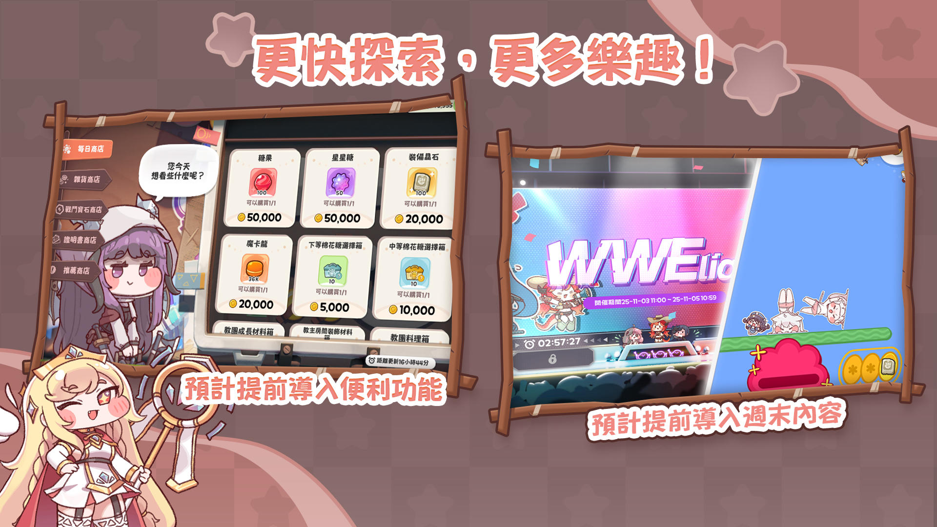 反正国际服和国服除了开服时间都一样,就拿台服的公告发了。【計劃提前導入便捷功能】韓國伺服器在1.5週年後導入商店大量購買功能、縮短農場胡蘿蔔獲取時間等便捷功能將提前導入。此外,還將提前導入韓國伺服器上正在使用的便捷功能。比如我們預計會在12月更新的版本中新增商店的便捷購買等功能。【計劃提前導入週末內容】為了讓教主們能更順利地獲得成長材料,我們計劃提前導入韓國伺服器1.5週年後逐步導入的週末內容