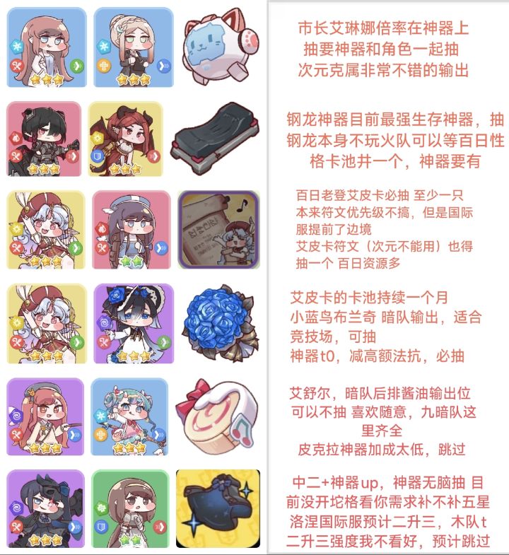 一图作者:未来可惜r补充:数据来源于国际服卡池,每排卡池持续2星期,其中艾皮卡百日老登池持续4星期。以下抽卡建议目标群体为0氪微氪平民,中氪以上根据自身需要额外下池(比如考虑组水队),并且抽专武尽量到3星以上。【跳】水队市长纯数值怪,顺属性次元大C,jjc能跟暗队扳手腕,代价是新养一队水成本高,平民人专都跳。【跳】秘书绑定市长。【跳】钢龙能抗能打,定位和强度接近玩偶。【抽!】专武先开