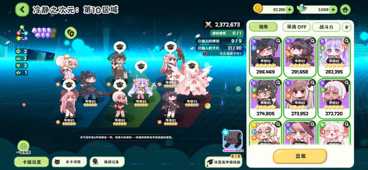 阵容VV+莫莫+7暗,因为我金蜡笔点的攻击、血量、暴击爆抗没点防御,所以我把前排和中排全部装的带防御的神器,保证优米、暗奶、V V+后排三个挂件存活到最后。