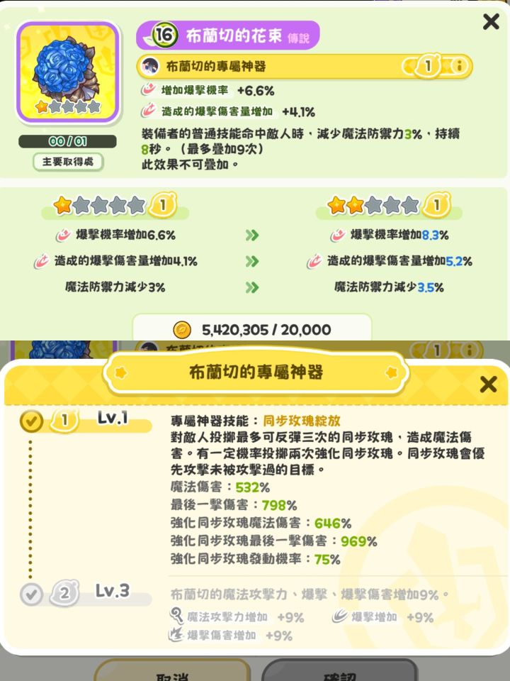 1.布兰切的花束售价16硬币增加暴击概率+6.6%造成的暴击伤害量+4.1%装备者的普通技能命中敌人时,减少魔法防御力3%,持续8秒。(最多叠加9次)专属技能加强布兰切低年级技能我的评价:强度一般,神器面板低且词条难吃满2.皮可菈的时尚化妆包售价23硬币攻击力增加+18.4%HP治疗量+14.7%治疗目标时,使被治疗目标的防御力增加8%,持续6秒。由卡片效果产生的治疗不会发