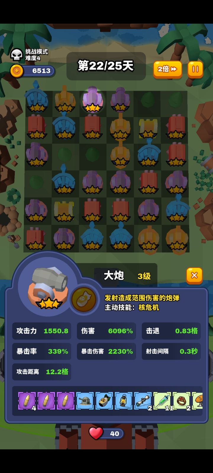 家人们,新上了一个解谜模式,玩法就是把下面的棋盘摆成上面屏幕上的排列,目前有20大关100小关。为了感谢支持,有老存档的玩家可以免费解锁前10大关。感兴趣的可以玩玩看。原先塔防模式的新内容要等我参加完gamejam之后再做了。目前计划的有:- 新地图、新敌人、和新的移动\合成逻辑- 新的装备/防御塔(以扩展包的形式推出)- 4级塔可能加入成长的设定还有一些已知bug,暂时在我这复现不出,