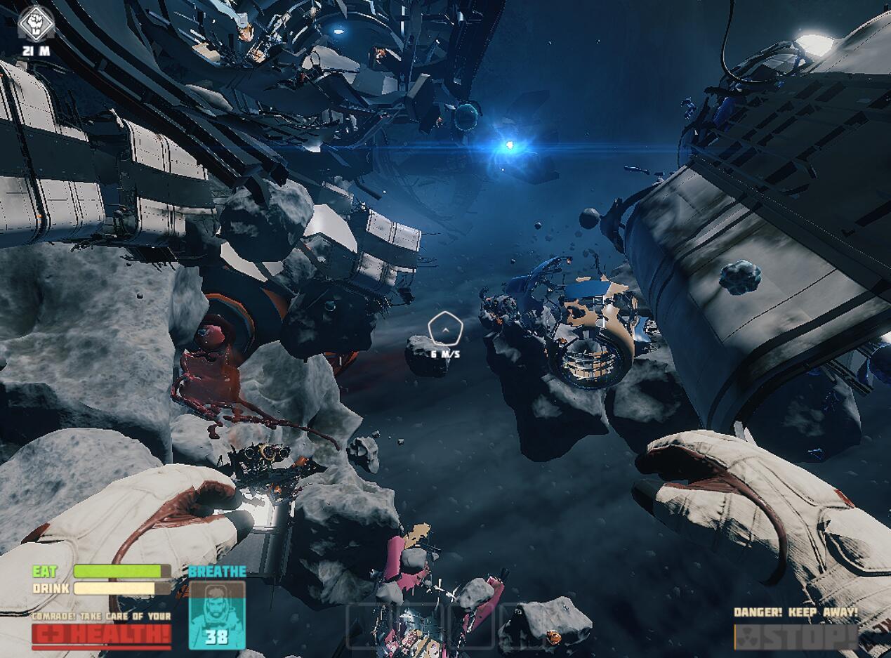 这游戏拾荒的时间是比较多的,需要的各种材料都需要主角去船舱外的残骸去寻找,虽然玩了一段时间后会有枯燥感,但总的来说可玩性还算不错。需要注意的是,本作有饥饿度和口渴度的设定,但飞船上已经连吃喝都没法直接解决了(至少我是没找到),我都是找到营养包和瓶装水的配方之后再去拾荒,通过拾荒获取材料再去工作台制作,也就是说连吃喝都得靠拾荒解决。后期应该有其他补给的方法吧。