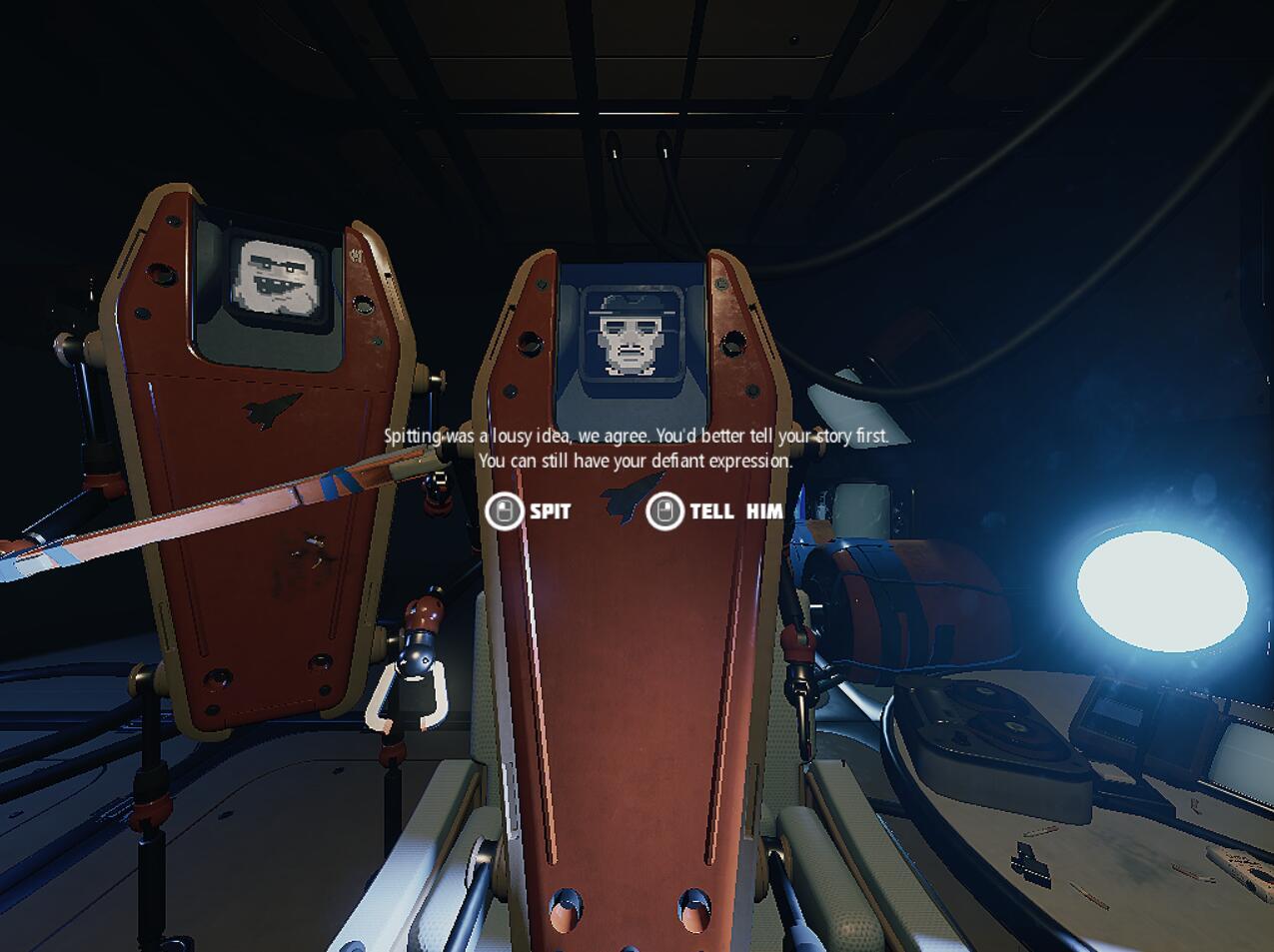 主角在被审讯过程中可以选择告诉它们事情的经过,也可以选择吐痰(不文明行为,请勿模仿)来表示抗议。每次吐痰都会被打手机器人敲一棍子,如果吐痰次数达到三次可以解锁一个成就,达到5次会因为惹怒机器人而导致主角当场去世。选择告诉实情才能将剧情推动下去。