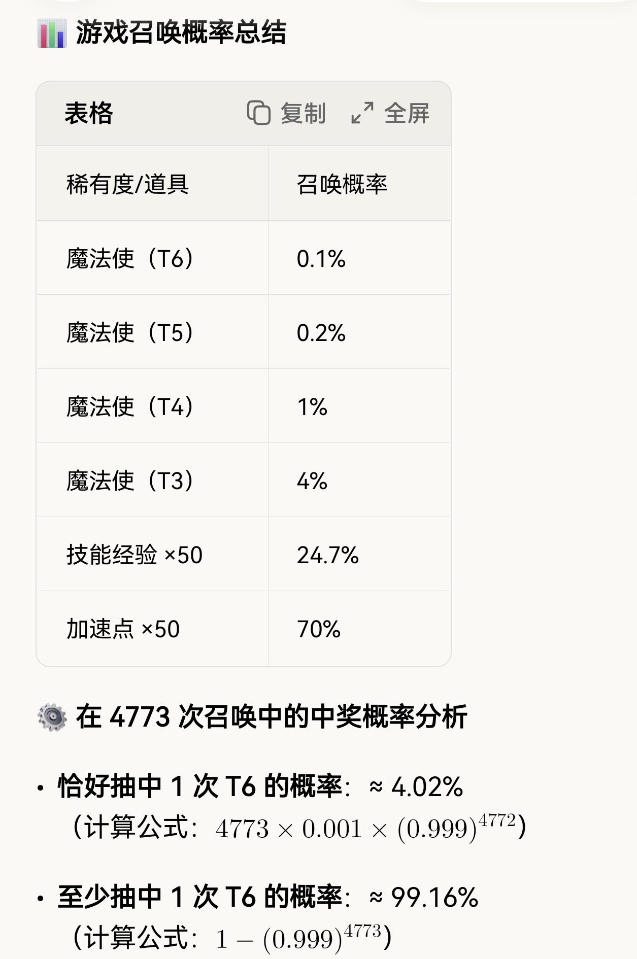 作为一名玩了45天的老玩家,我一直很喜欢这款游戏的画风和玩法,也愿意为爱买单。但最近的抽奖体验真的让我破防了——我在“魔法使”卡池累计抽了4773次,竟然只靠自己抽到了1个T6!公示概率明明写着T6概率0.1%,按期望值至少也该获得4-5只。更让我困惑的是,身边有些玩家会连续抽出2-3只T6,这种落差让我不得不对概率机制产生疑问。发现问题后,我尝试联系官方寻求解释,结果却更让人困惑与失望:我