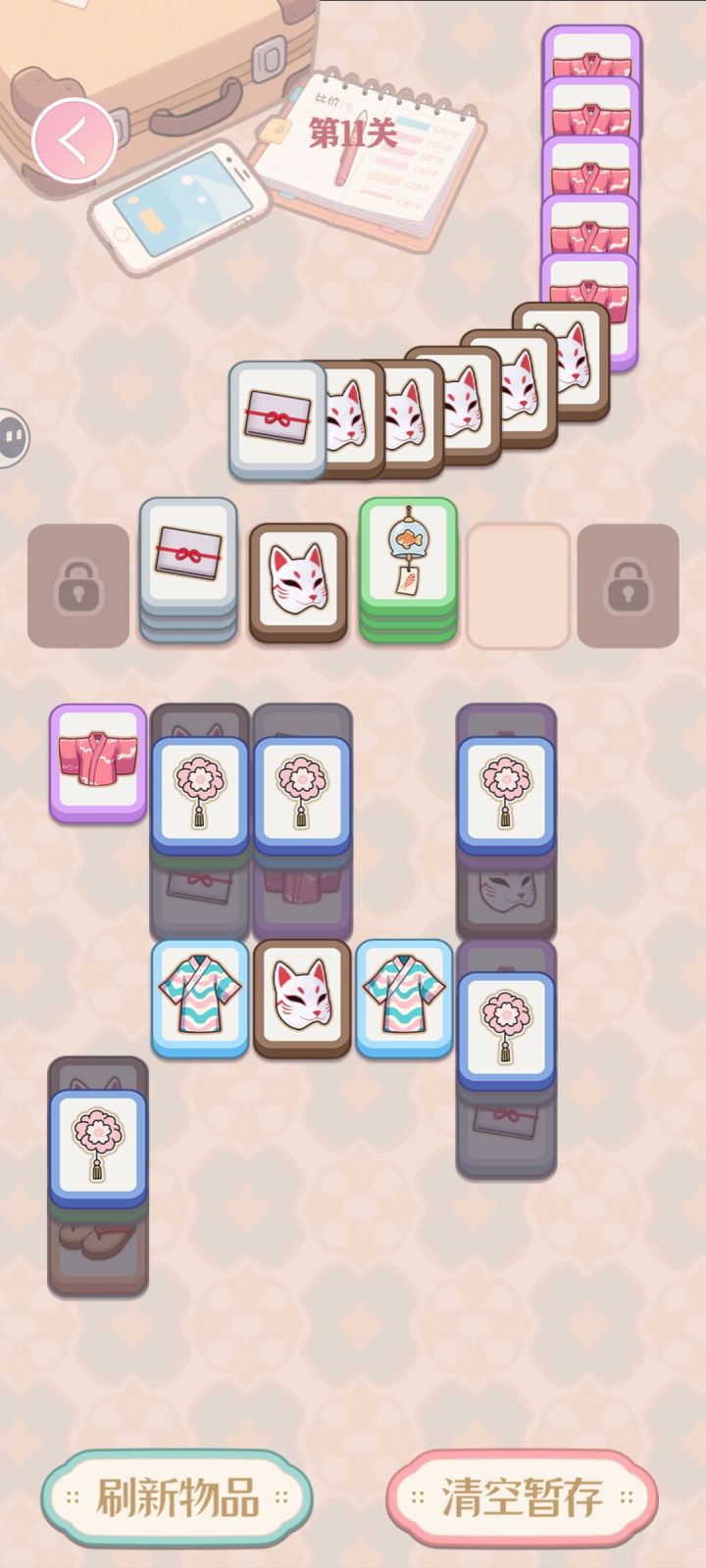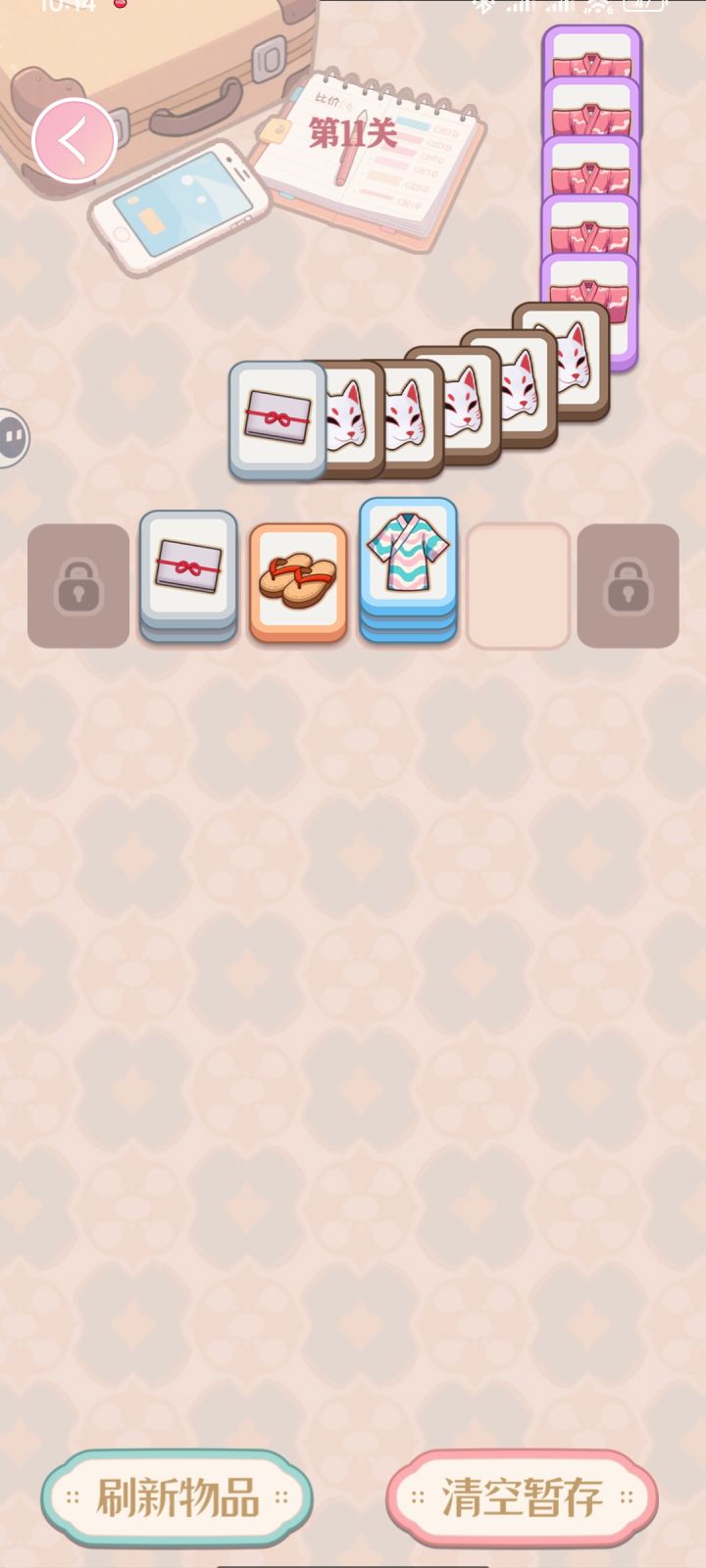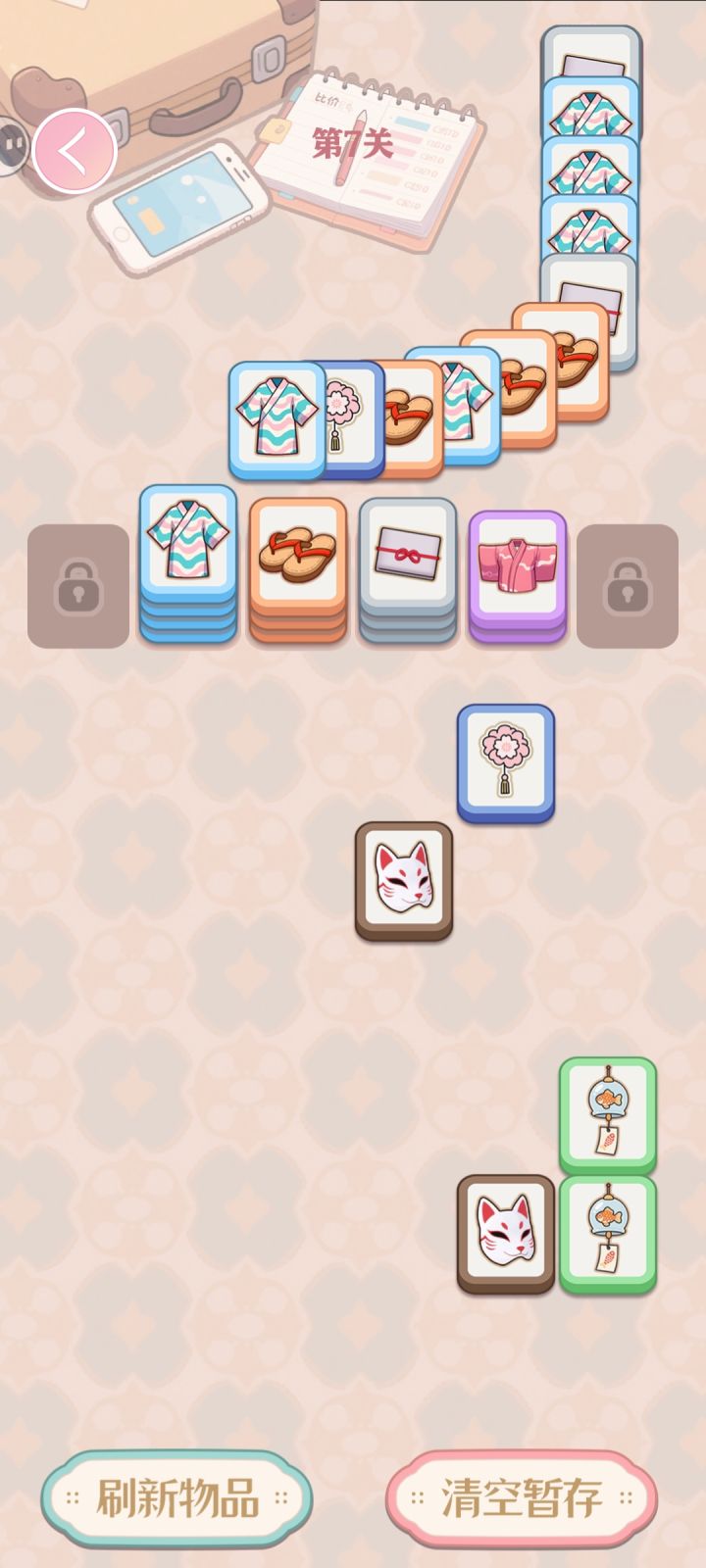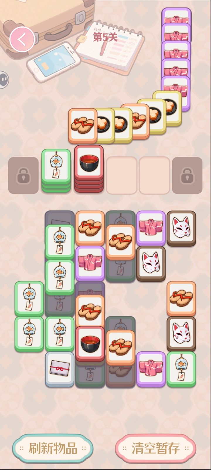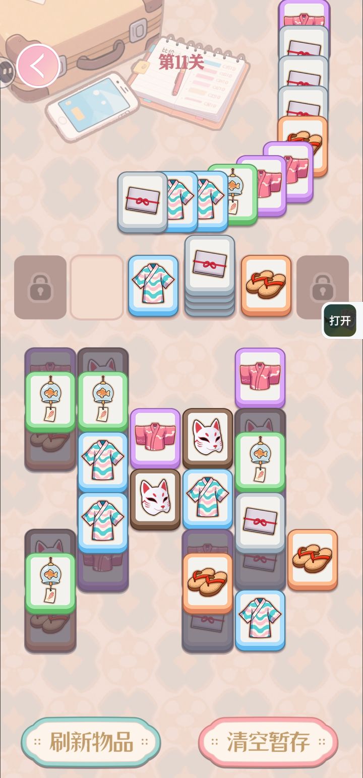 规则设计还不错的休闲小游戏,目测后面广告会有点多。玩法是堆叠消除,同一种满5张堆叠即可消除,下方是类似羊了个羊的方块堆叠塔,上方有牌出现,根据上面牌型来点选下方的牌形成消除,上下全部清空即可过关。
