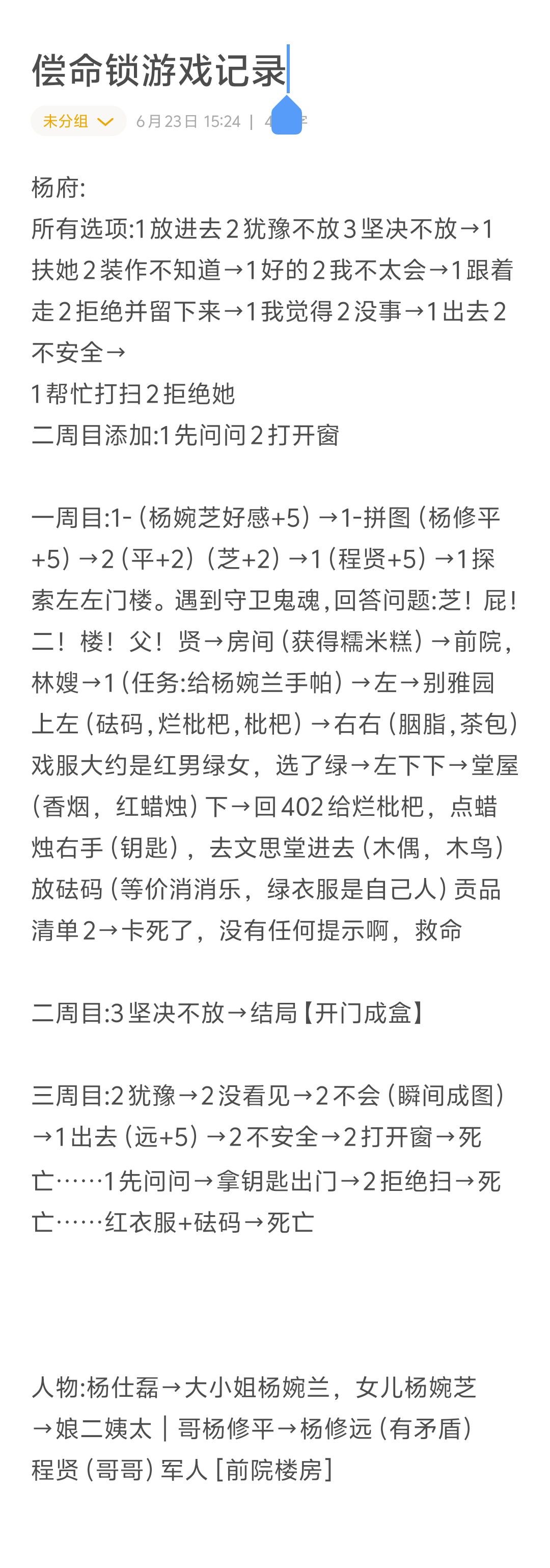 结束了上个被强行喂翔的游戏后又发现了个不错的游戏,内心得到了极大地缓解~这次的游戏【偿命锁】比较特别,因为npc竟然有好感度!而且晚上是自由探索的,场景比较多攻略比较难写,但是的确很有意思,现在只有个第一天的试玩版,有点期待游戏正式上线哦~因为游戏涉及到了很多选项所以这里把选项也都说一下哦。【书房查看盒子选项】 放进去-穿越 犹豫但不放-被追后还是要放进去-穿越 坚决不放-死亡(成就【开门成盒】)