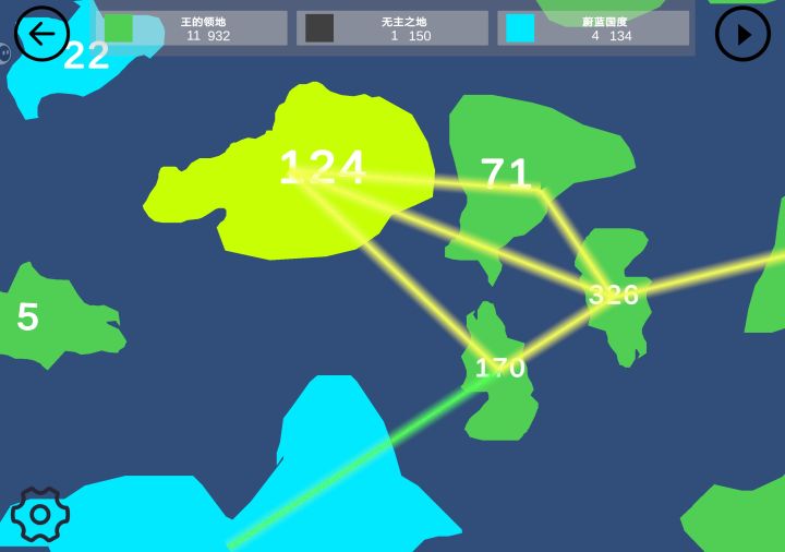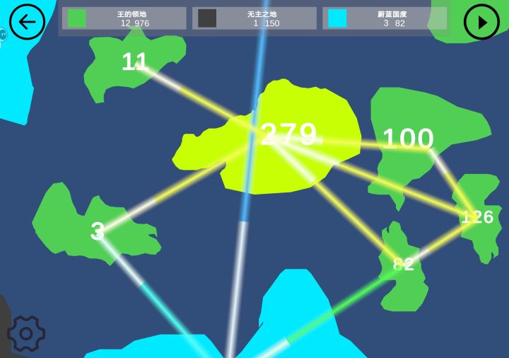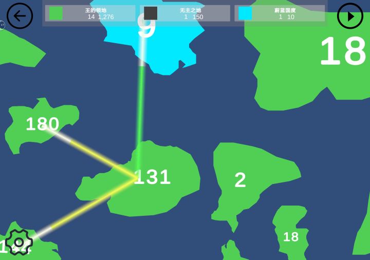 战斗比较注重策略性,战略方面与同类游戏基本一致,以多打少。点击己方区域再点其他区域可派兵,同一块地支持多线派兵,但消耗是可以肉眼可见的,也容易被其他颜色偷袭。