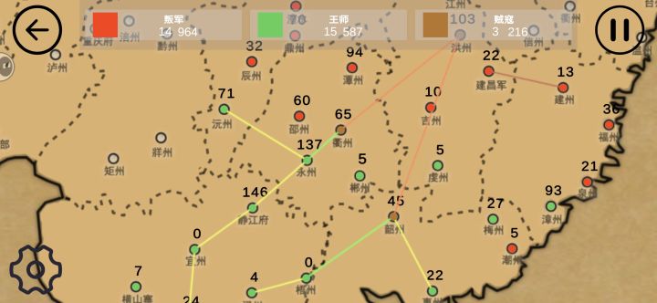这是款很有潜力的游戏,表面粗糙但玩法很独特且硬核😎,很适合军事发烧友和热爱历史的玩家,简单分享一下攻略:游戏前九关主要熟悉玩法,第十关很有挑战性!想要获胜必须熟悉地图,我们可攻略的城池可分为资源洲和交通府,只有资源洲可募兵,交通府是通往其它城池的要道;第十关前期打掉红的飞地😆这是连通两广地区的关键,之后我们要保住惠州这里募兵很快,中期我们和土匪来回拉扯,不要为交通府浪费太多兵力因为土匪能飞地,会偷袭后方!我们可以把郴州这样的地方让给土匪让他承担红的进攻,后期我们分两线进攻,一线从静江府北伐,另一线向东南沿海进攻。玩这个游戏很考验耐心,一时胜负不要在意,做到知彼知己,百战不殆😠!祝各位将军早日克复中原!😘😘