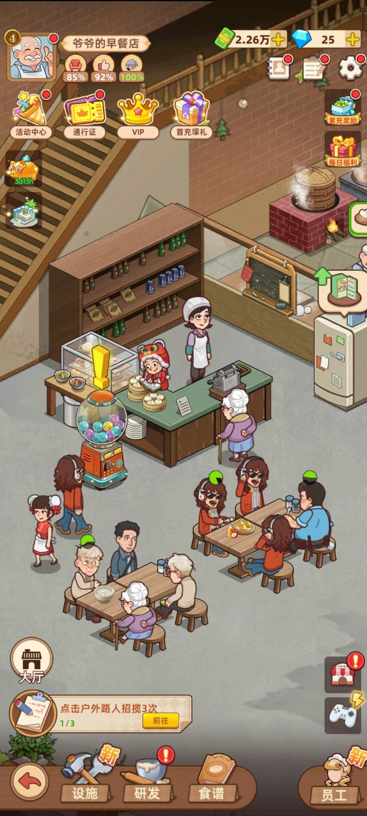 这个游戏,好像小时候二嬢家开的面馆,就那么几张桌子,人来人往。我只管蹭饭,没想到自己经营早餐店还有点麻烦,要买食材、洗碗、研发新菜......游戏风格有点可爱,有点复古,人物看起来有点假,好在场景比较真实。游戏还内嵌了几个小游戏,很解压。只是“元素获取”小游戏的体力太少了,点几下就没了,现在很缺元素球,没有元素球怎么研发新菜呢......刚刚解锁后院,发现新天地,居然还可以种地、可以养鱼。不