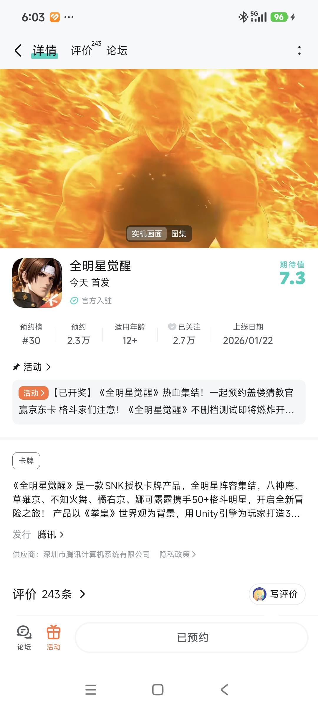 预约今日,决胜明日!SNK正版授权,全明星阵容即将登场!格斗之火已点燃,传奇角色待唤醒。立即预约并盖楼助力,抢先锁定京东卡及开服福利!【活动方式】在本帖下方盖楼回复你的预约截图(需带预约成功标识)并写下你最期待在手游中体验的格斗家或对战模式,即有机会赢取京东卡~【活动奖励】幸运奖(3位):100元京东卡【活动时间】1月20日-1月26日【活动规则】1、获奖名单将于活动结束后5