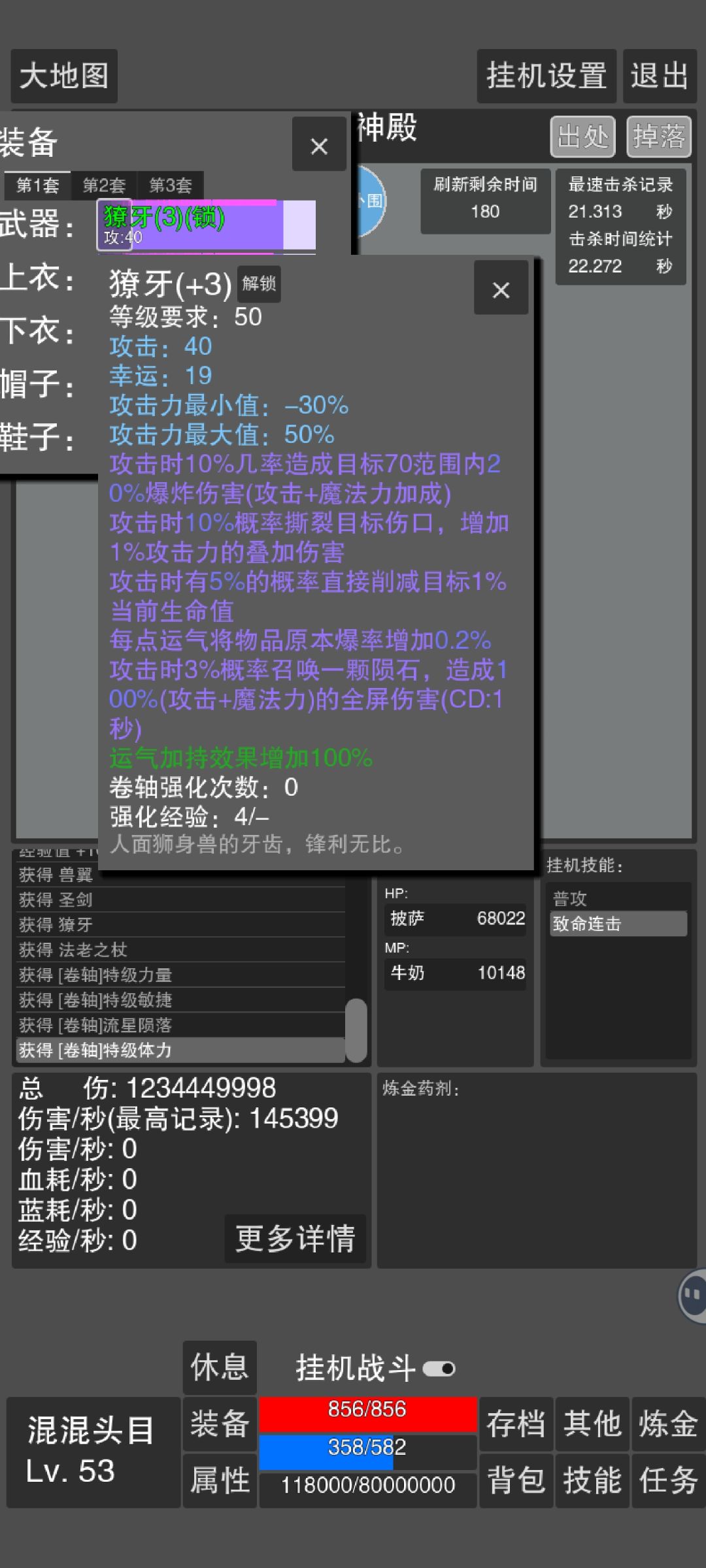力量撕裂飞弹流 推荐职业黑法师 核心技能 伤口撕裂 分身 双发飞弹 核心附魔 伤口撕裂 飞弹专精 评价 对单叠叠乐 秒掉低级boss 然后带着低级boss去打高级boss 让boss抗伤害不掉血 前期没技能打不出来 练级能力t3 保证命中够的情况下全叠力量即可 用处不大 纯花活 逃课打法