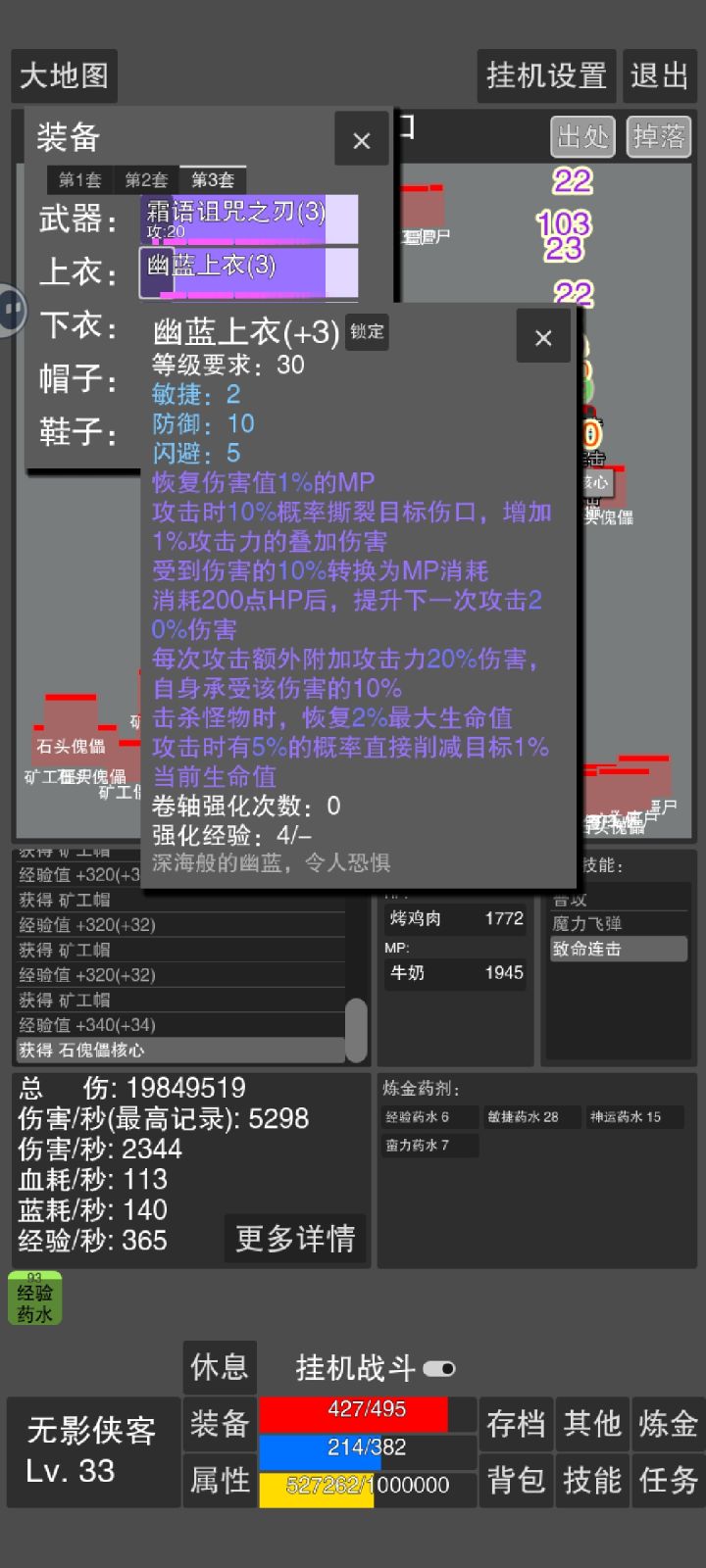 无影游侠和黑魔法师 毕业词条参考图片 53级后可以附魔装备,游侠附魔是攻速移速的提升效果提升200%。魔法师附魔是多一个分身25级二转后可以去刷下面三张地图的boss,水晶守卫需要血量600,会眩晕三秒无法补血,伤害在依据装备防御150-170左右,600血防止暴毙,邪龙需要血量800,有火球和召唤小怪技能,实测700血量经常暴毙,火球伤害在480-720之间。50级boss伤害会每秒提高五点,