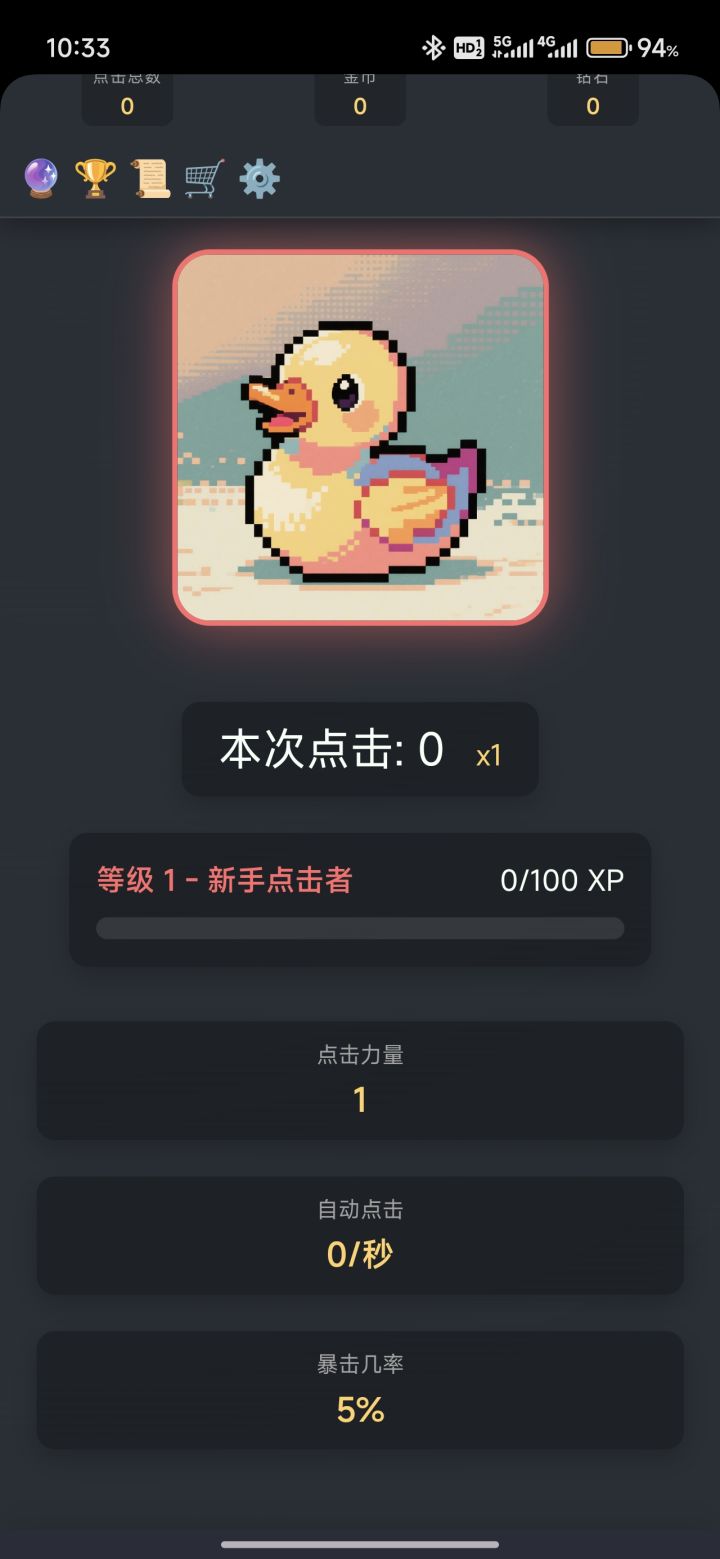 ✨以超萌小黄鸭为主角,狂戳屏幕开启趣味养成之旅~🎯每日任务超丰富:完成点击次数、升级、暴击等挑战,累计点击还能解锁「新手→大师」成就链,金币奖励拿到手软~🌳策略性技能树玩法来袭!用技能点点亮「力量提升」「自动点击」双系技能树,🛒商店更有力量药剂、自动点击器等助力道具,金币一键升级体验!🌟简单易上手的戳戳玩法+治愈像素画风,碎片时间随手开玩,轻松养鸭无压力~😌👇戳下方预约→第一时间收取