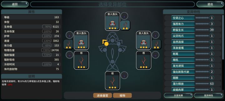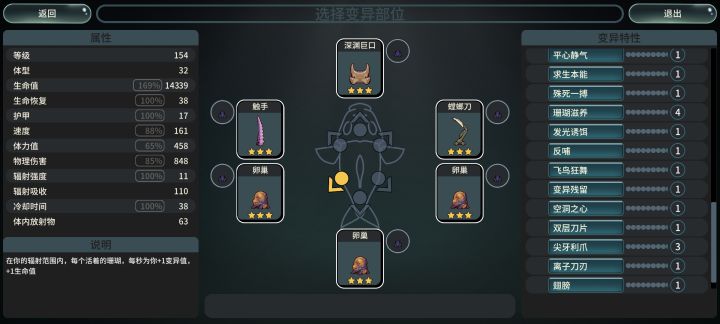 : 我的玩法是三个寄生吸管和三个卵巢,然后要拿一个叫做什么破体而出。就是说敌人死后有50%的概率能成为你的子孙。这个玩意儿在加衍生物爆炸。你不用担心输出,因为你根本死不了。寄生吸管还要拿一个力量汲取。因为我发现拿了这个玩意之后,你的速度快到飞起。发现太快了之后,我就立马拿一些减速的,它就不怎么快了。还有增重一样拿起来。因为我那时候玩的时候血量在130。就在这个血量最低跳到了一左右。但是会立马跳回来。前期比较难成型。中期会大概率成型。后期挂机就行了,因为变异值加的很慢。
