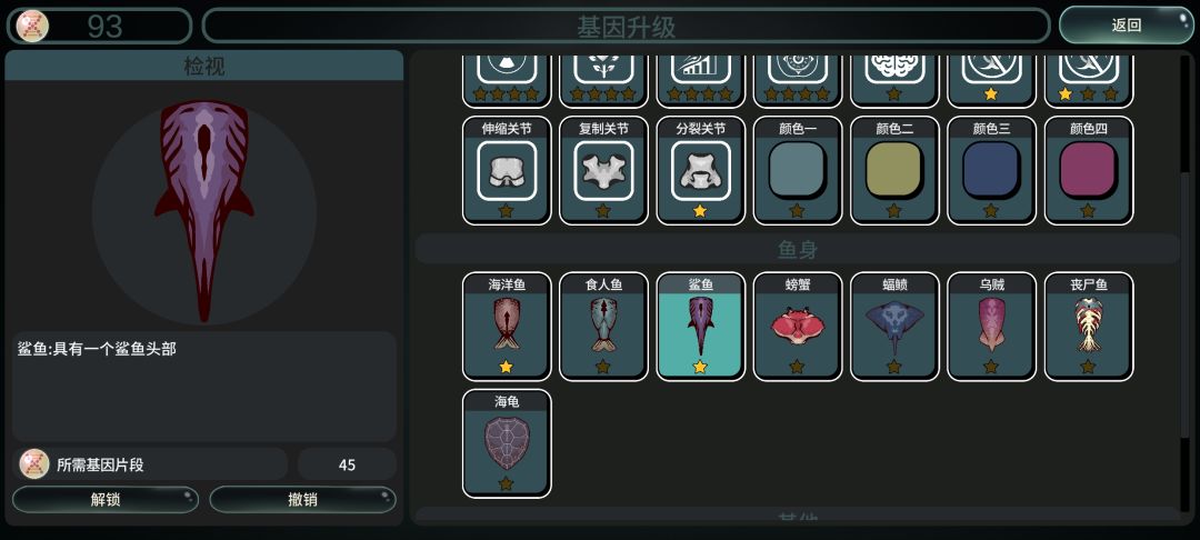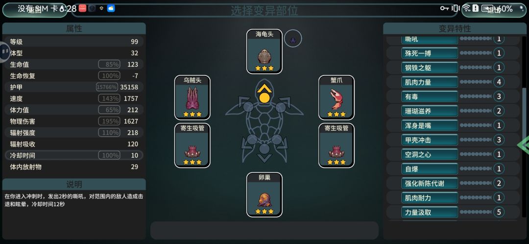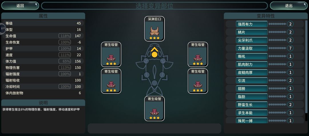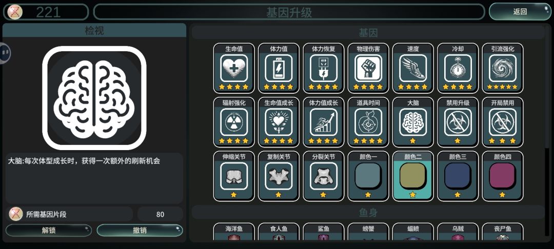 先展示结果: 核心局内天赋 “眼”的冷却1秒,“震慑”每升1级多晕1秒,只要到2级,就可以无限眩晕。注意,升级“眼”只加范围和眩晕时长,前期略鸡肋,不推荐升级,最好多放几个部位,或者选其他优秀的天赋。 下面是楼主22级的配置,已经够用。 身体最好选丧尸鱼,楼主发现,这个身体几乎是法术(辐射强度)圣体! 随便装器官,不用担心掉血;免疫环境辐射伤害,快速吃经验,还能消耗其他npc小鱼。最重要