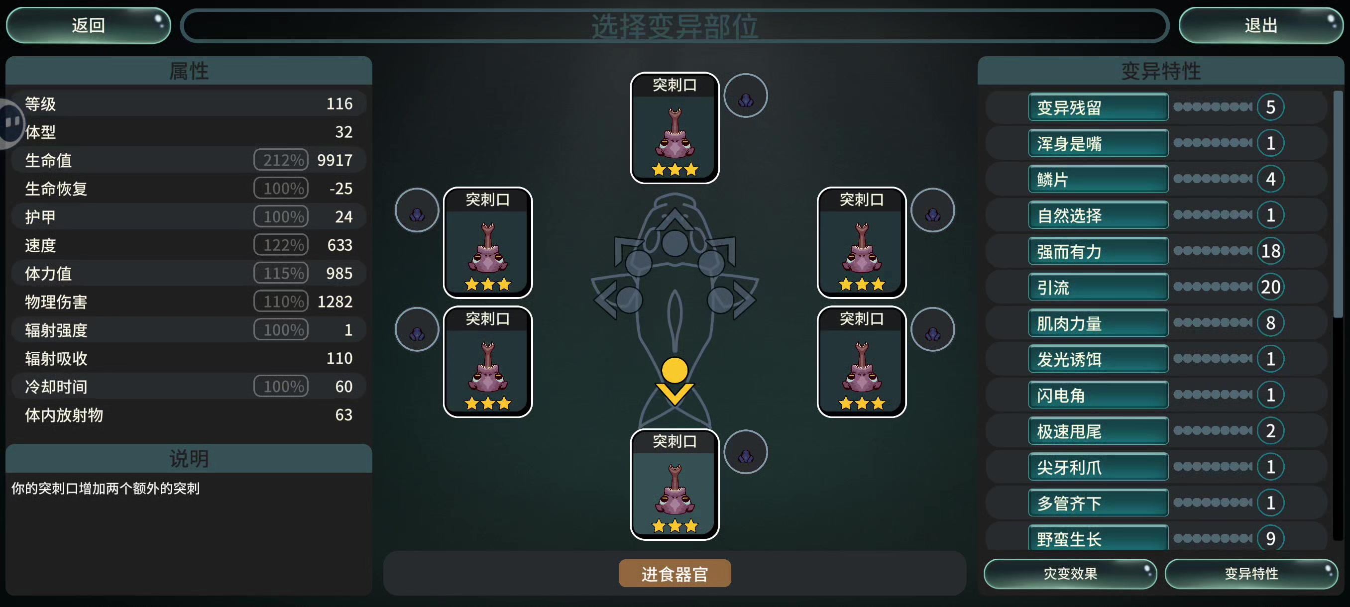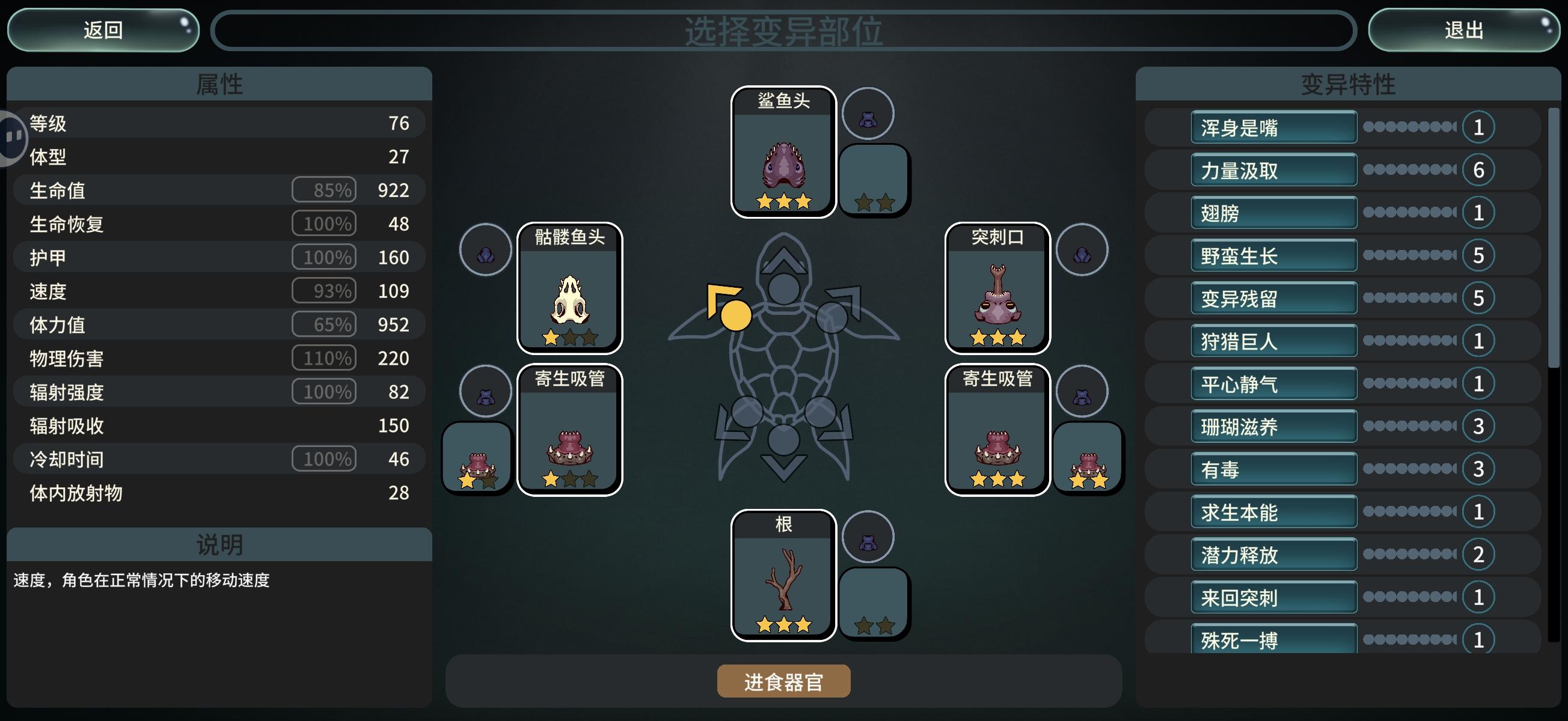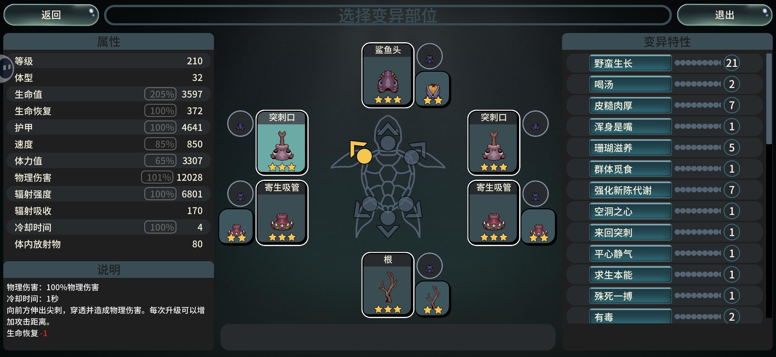 标准公式,寄生加突刺,前期鲨鱼头用于以小欺大,伤害很够,后面可以换,我都懒得换,准备录视频的时候给我卡出来了,后期寄生吸的属性够多的时候,可以一直冲刺,撞一下两万多伤害,化身百吨王,加上闪电领域,辐射范围内直接清空