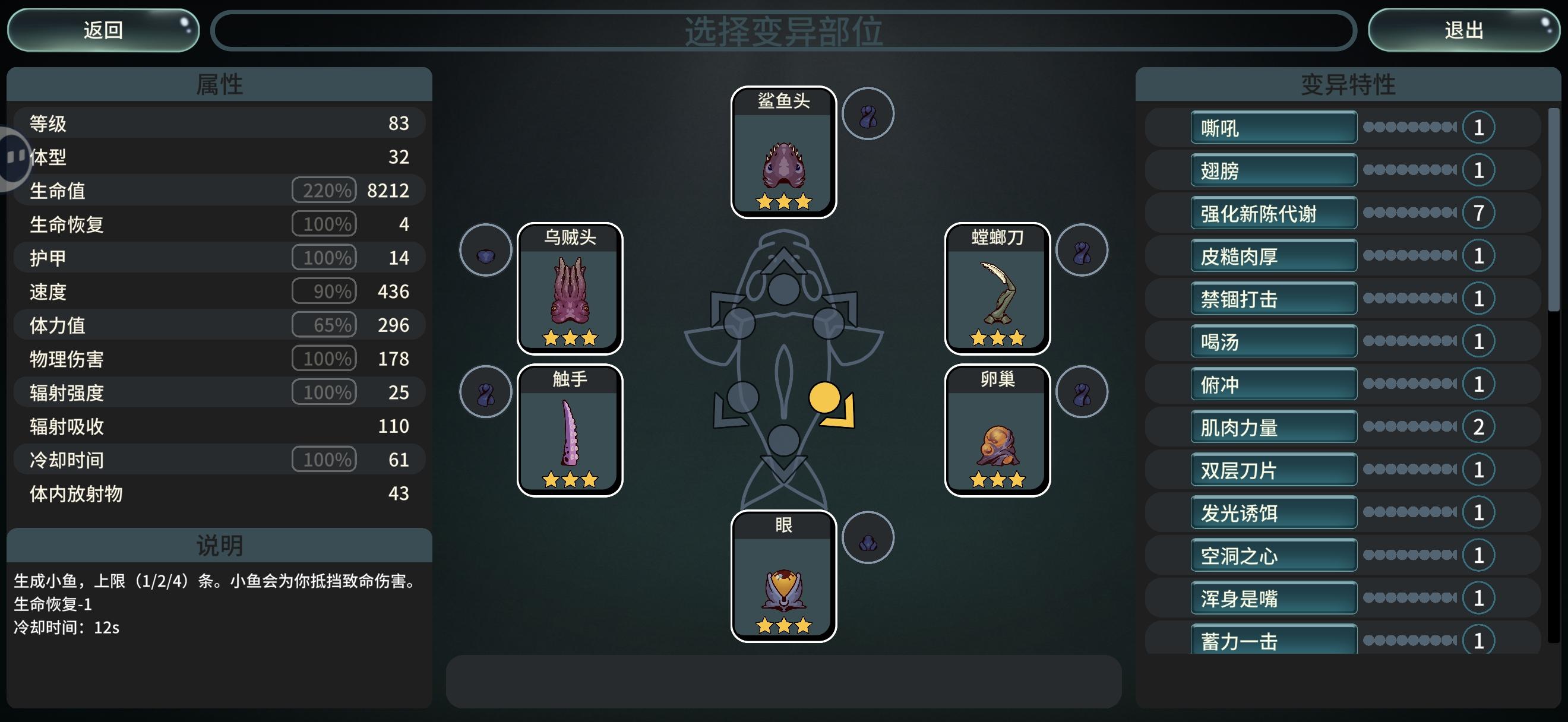 吸管跟卵巢 升级技能 破体而出 小鱼有自由觅食跟群体变异 负责收集经验 闪电角 引雷 震慑保证怪进入辐射范围罚站 吸管负责偷属性 配合引雷输出[表情_吃瓜]之后就不知道还能玩啥了
