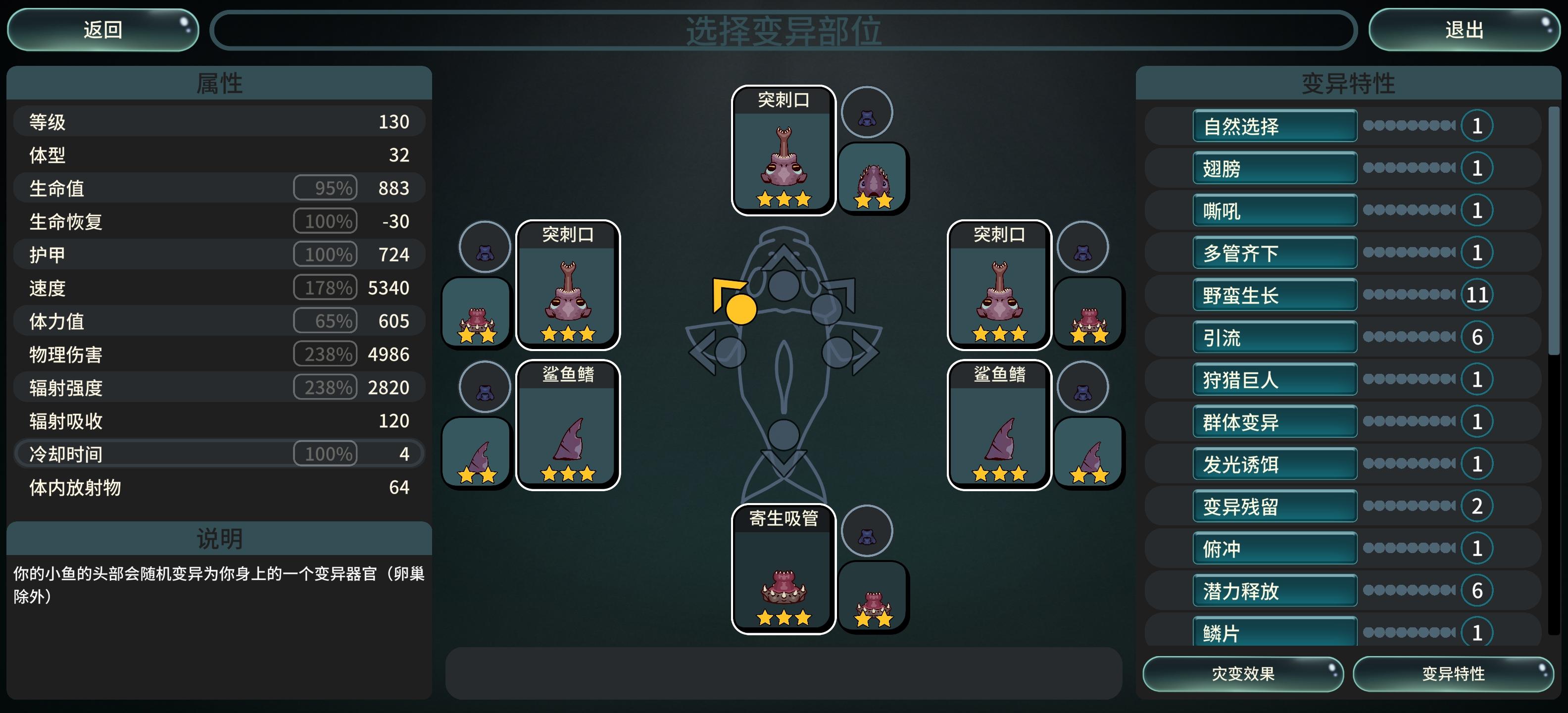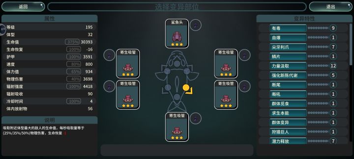 上左右格子,3个触手+3个弱化关节,二级根 下部分格子,3个根+3个复制关节 进化属性优先级,从高到低:辐射吸收率,物理伤害,冷却,生命值(选了用血量代替体力值)