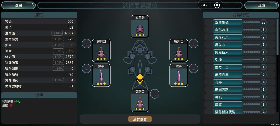 海鱼开局,六个关节位都上分裂关节,头2突刺,前两螳螂刀,后两一刀一吸,尾一吸一刺。 我发现一个bug,速度太快有时候会突然变慢,可能变慢一点点,可能慢到爬不动,过一会又卡回原速了,确定没有阻挡物。