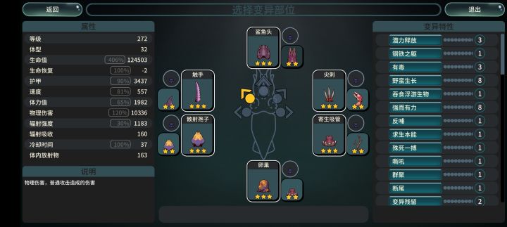 非常简单无脑爽的构筑,我再补充几点。1,选散射孢子而不是追踪孢子。散射升一级+2孢子,追踪只+1。2,优先把一个散射孢子升满再装新的,而不是同时装好几个1级的。3,一定要选一个“刷新变异次数+1”的变异。4,有刷新次数的时候,一定要优先刷出散射孢子相关或减cd的变异再选,而不是看到能用的就选而不刷新,例如看到“鲨鱼鳍”能用就选了,有次数也不刷新,这样会导致成型非常慢。