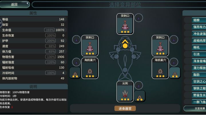 前言:游戏本质上只需要两种器官,进攻和续航,大部分的器官变异以及物理和辐射伤害属性到后期都挺强的可以乱杀,但前提是能发育起来,没发育起来或者发育的不够快就会被人机鱼两口就舔死了,所以能快速发育就很关键,只有发育起来你才能随心所欲的玩你想要的组合,视频里的组合是我测试下来的版本之子
