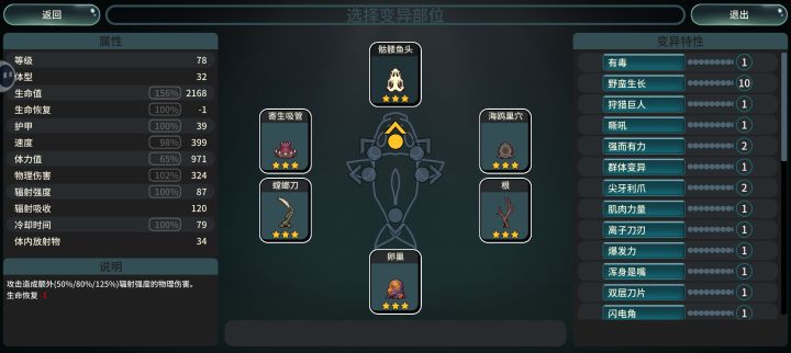 我感觉最强的进化路线,应该是前期加速度和伤害,拿一个满级卵巢(这个可以挡致命伤,所以不要血量),拿最超标的口器 突刺口(伤害最高,范围最大,吃食物范围最大),拉满速度,后面看着拿到冲刺消耗血条就可以无线冲,我拿翅膀只是感觉好看,感觉吸血或卵巢更好点,突刺口一般拿前面就行了,后期叠加物伤,冲刺加伤