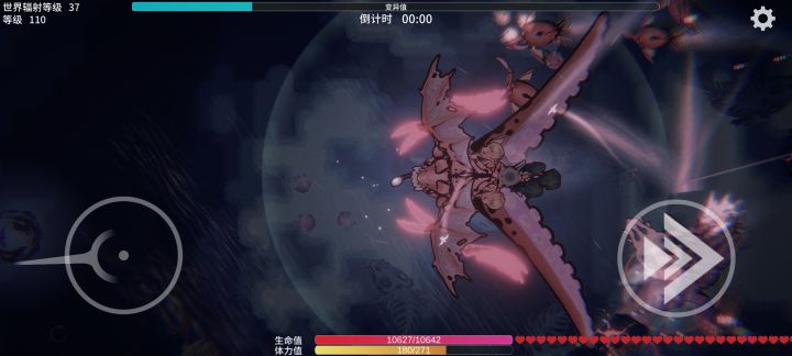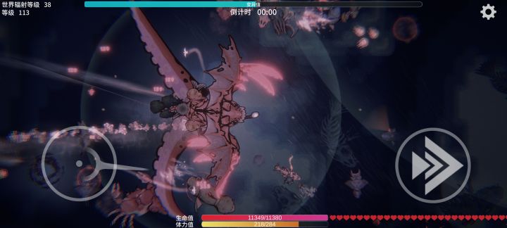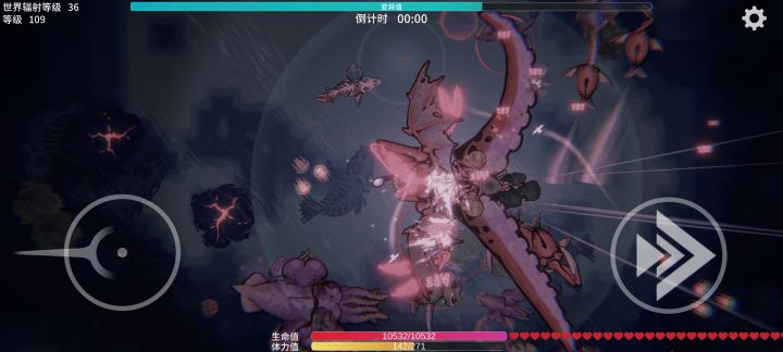 第二关打了两把都死了……菜的抠脚于是放弃探索后面的内容,重开了一把第一局,然后就打了快四个小时…?这东西没等级上限的吗?我手机卡成PPT了还能升级,不管来的啥妖魔鬼怪长得多抽象,在我面前撑20秒一条命就爆炸了。我自己更是不知道吃了多少颗心,估计70起底,毕竟打了三分之一多一点的时候就数来有21条命了。无脑选生命恢复,有命才有一切。开局本来是和一个触手螃蟹二分天下的,后来等我生命和生命恢复还有护