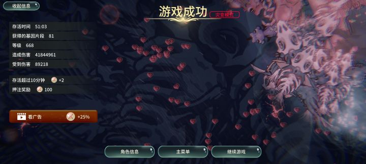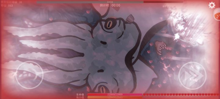 第二关打了两把都死了……菜的抠脚于是放弃探索后面的内容,重开了一把第一局,然后就打了快四个小时…?这东西没等级上限的吗?我手机卡成PPT了还能升级,不管来的啥妖魔鬼怪长得多抽象,在我面前撑20秒一条命就爆炸了。我自己更是不知道吃了多少颗心,估计70起底,毕竟打了三分之一多一点的时候就数来有21条命了。无脑选生命恢复,有命才有一切。开局本来是和一个触手螃蟹二分天下的,后来等我生命和生命恢复还有护